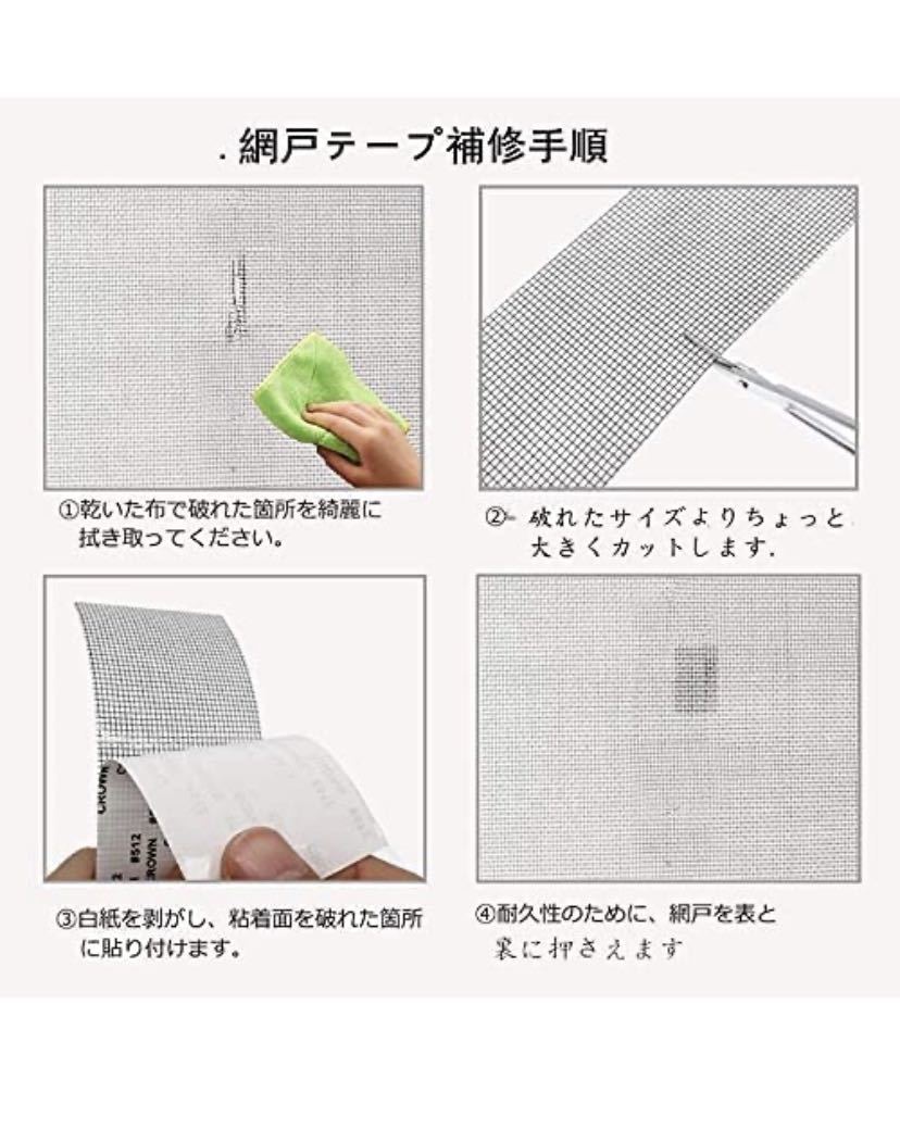 【使用便利な網戸 穴 補修 テープ】:1.雑巾で綺麗に穴を掃除2.破れた穴のお大きさによってテープをカットする。3.破れたところに貼り付け、しっかり押さえたら、完璧に終了。