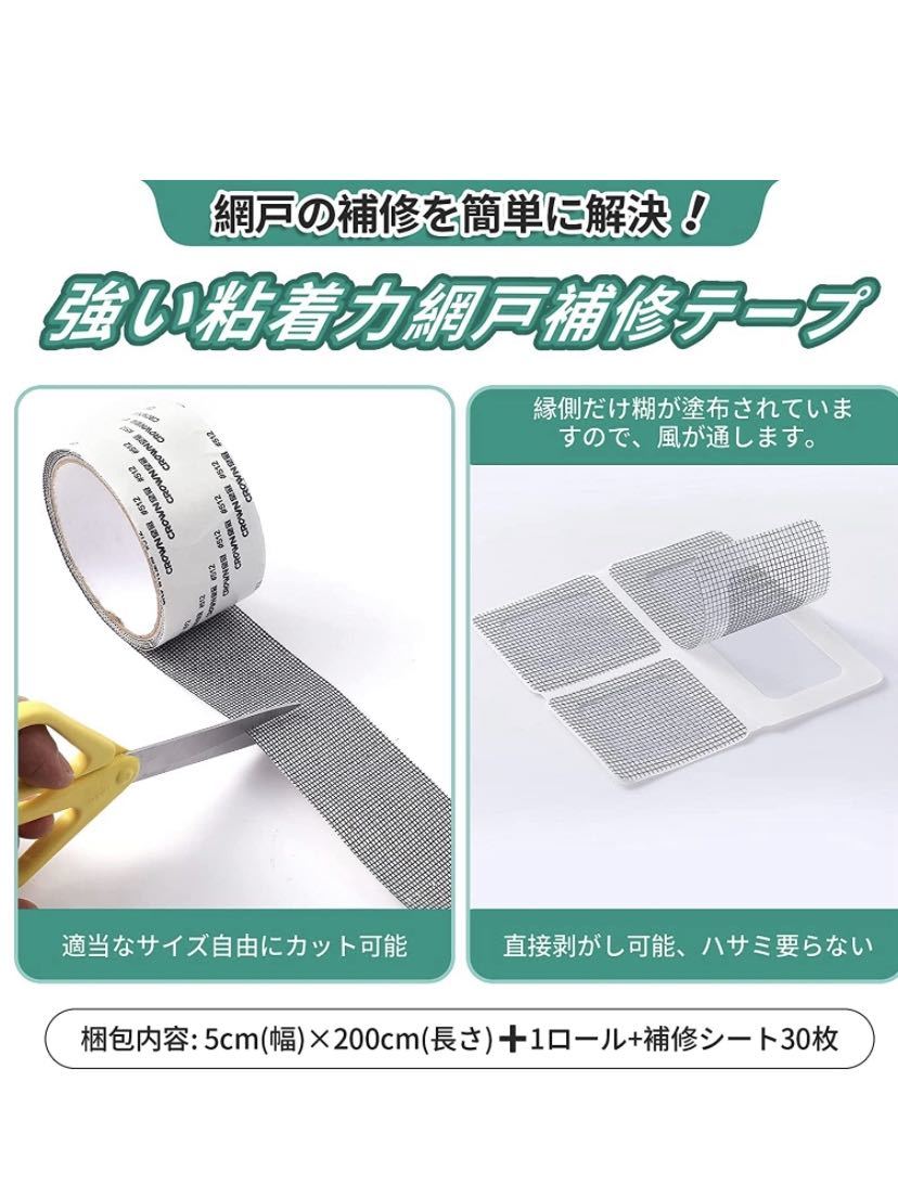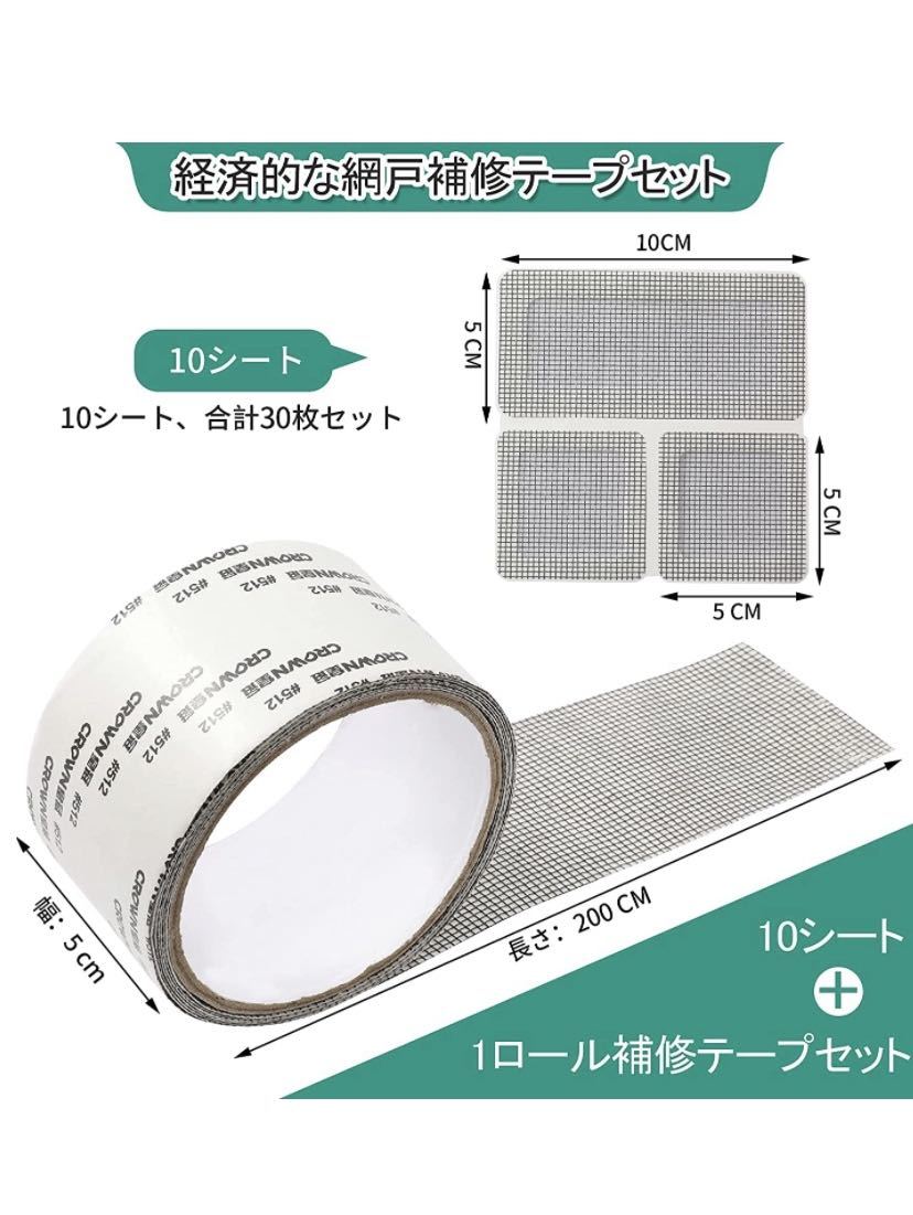 【商品情報】:2M(長)×5㎝(幅)網戸補修テープ×1ロール+とても通気性が良い、1シート3枚の網戸補修シート×10シートのセットです.とても実用性が良い組合商品です。