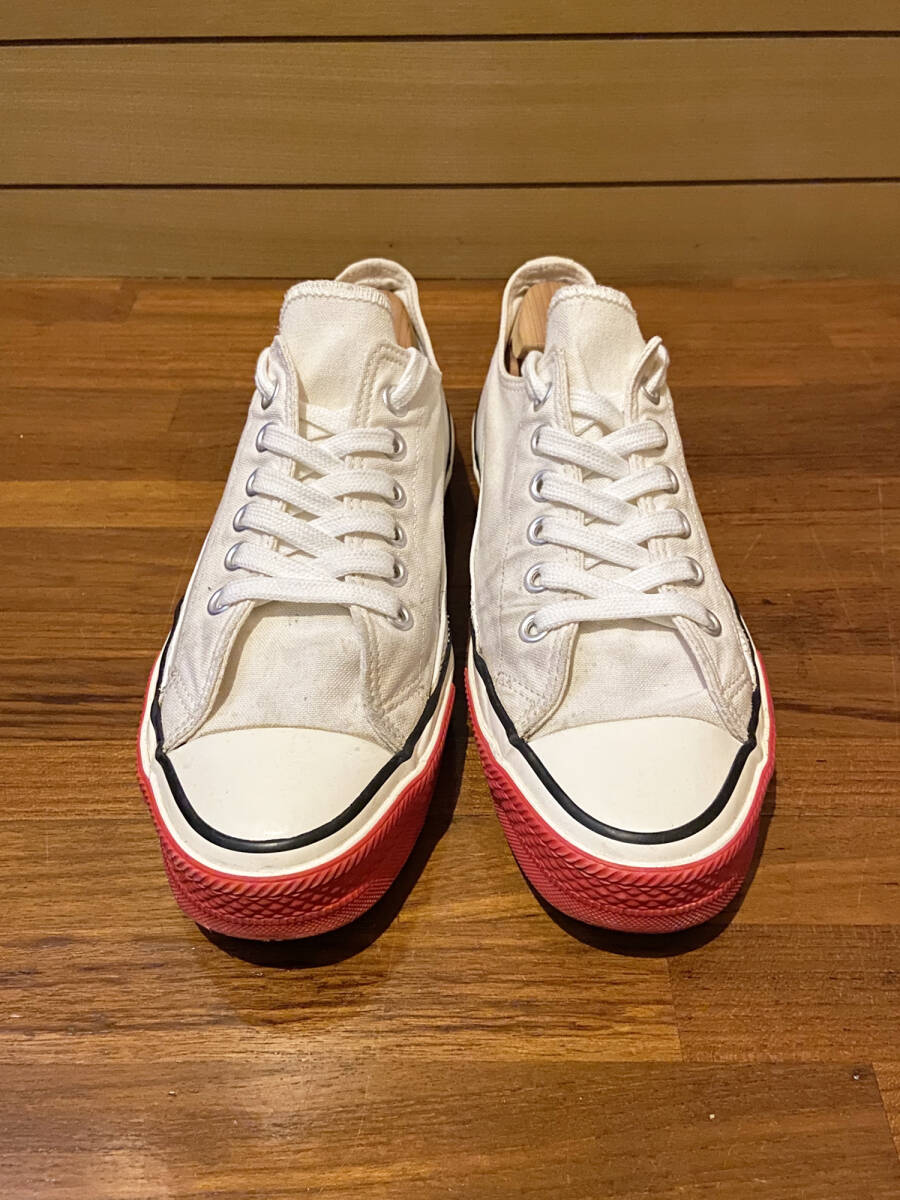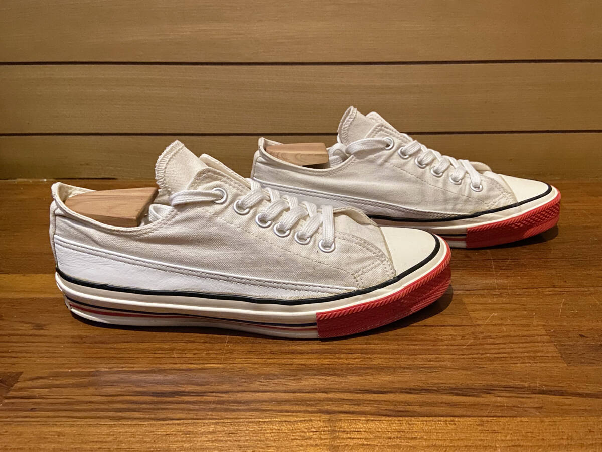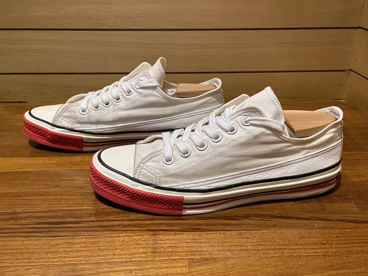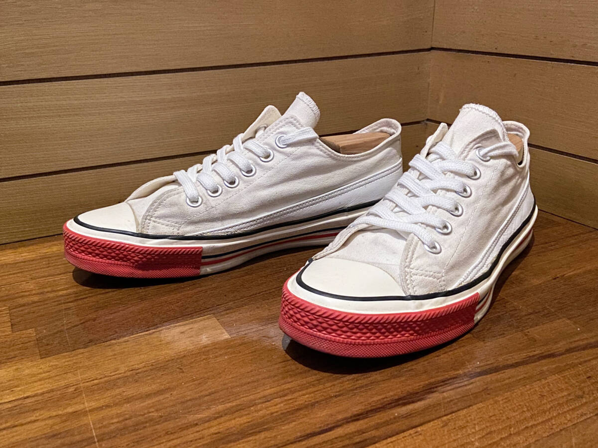 こちらのオールスターも爪先部分に色を付け、サイドにレザーの補強パーツをつけた絶妙なデザインとなっています。