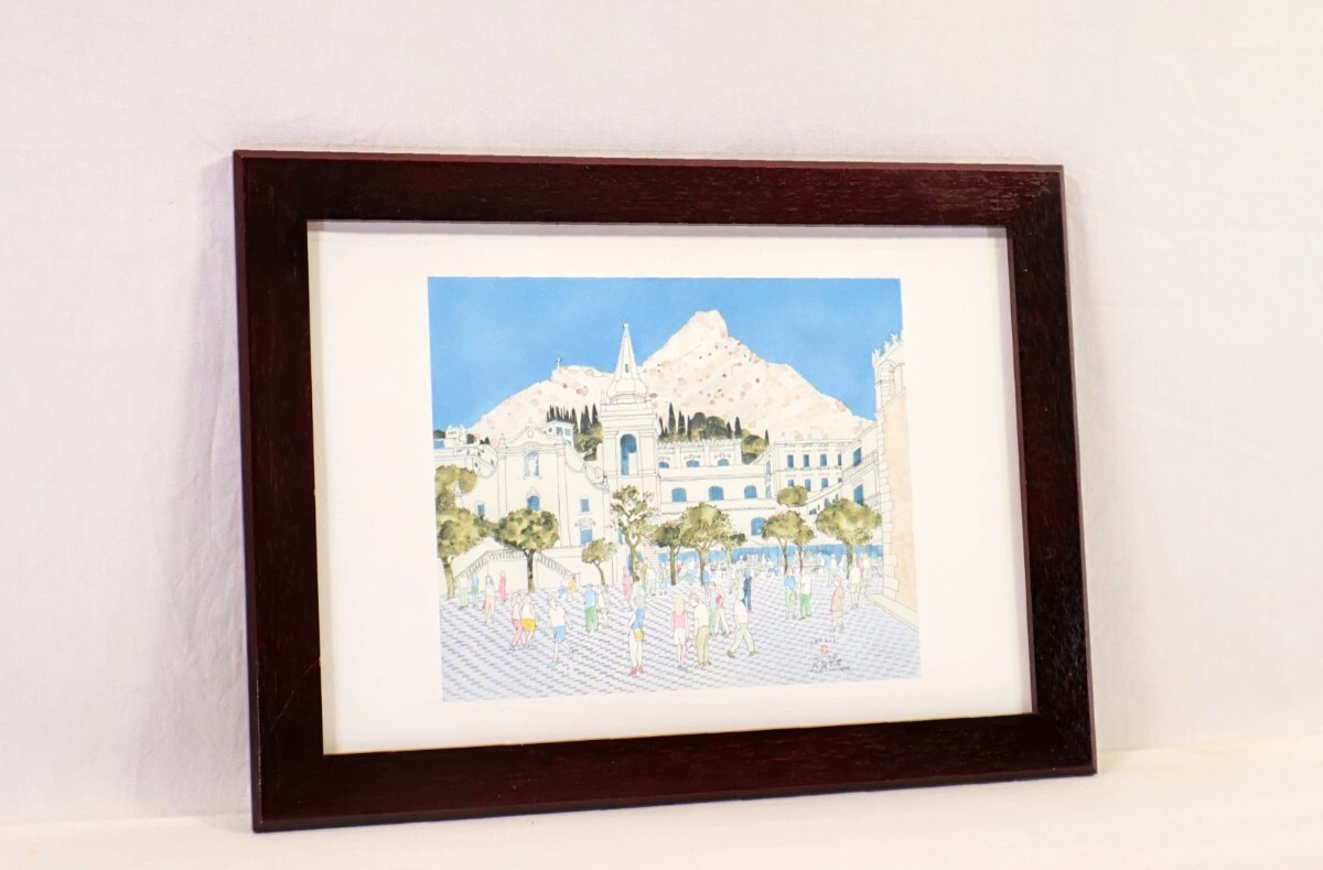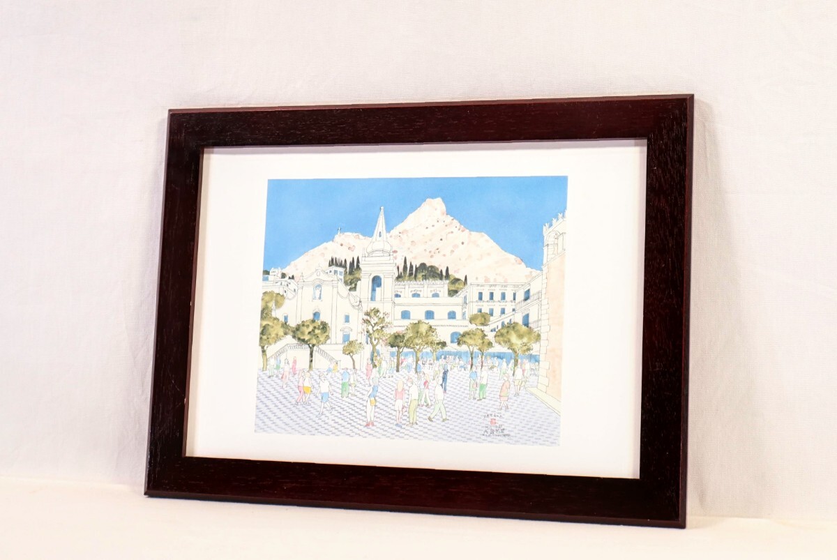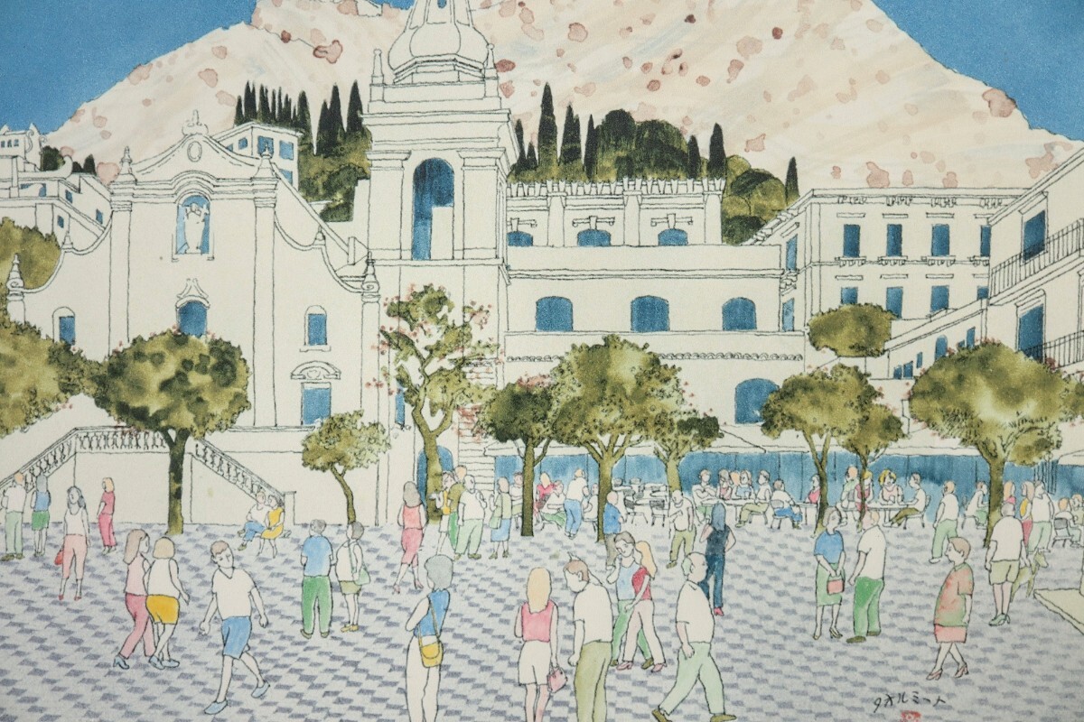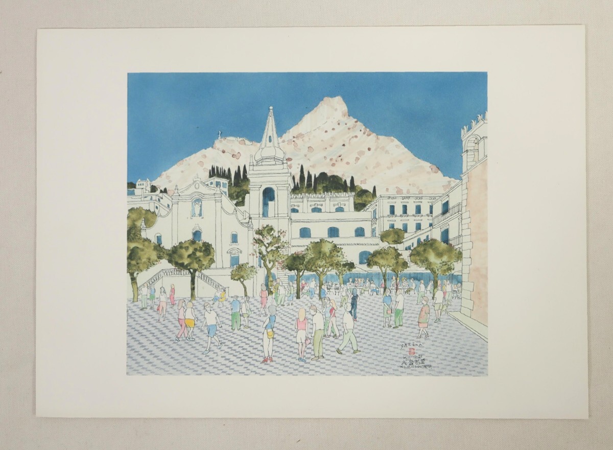真作 大音恭豊 ジクレー「タオルミナ」画寸 19.5×16.5cm 兵庫県川西市住 イラストレーター 伊シチリア島 サン ジュゼッペ教会と広場 9696