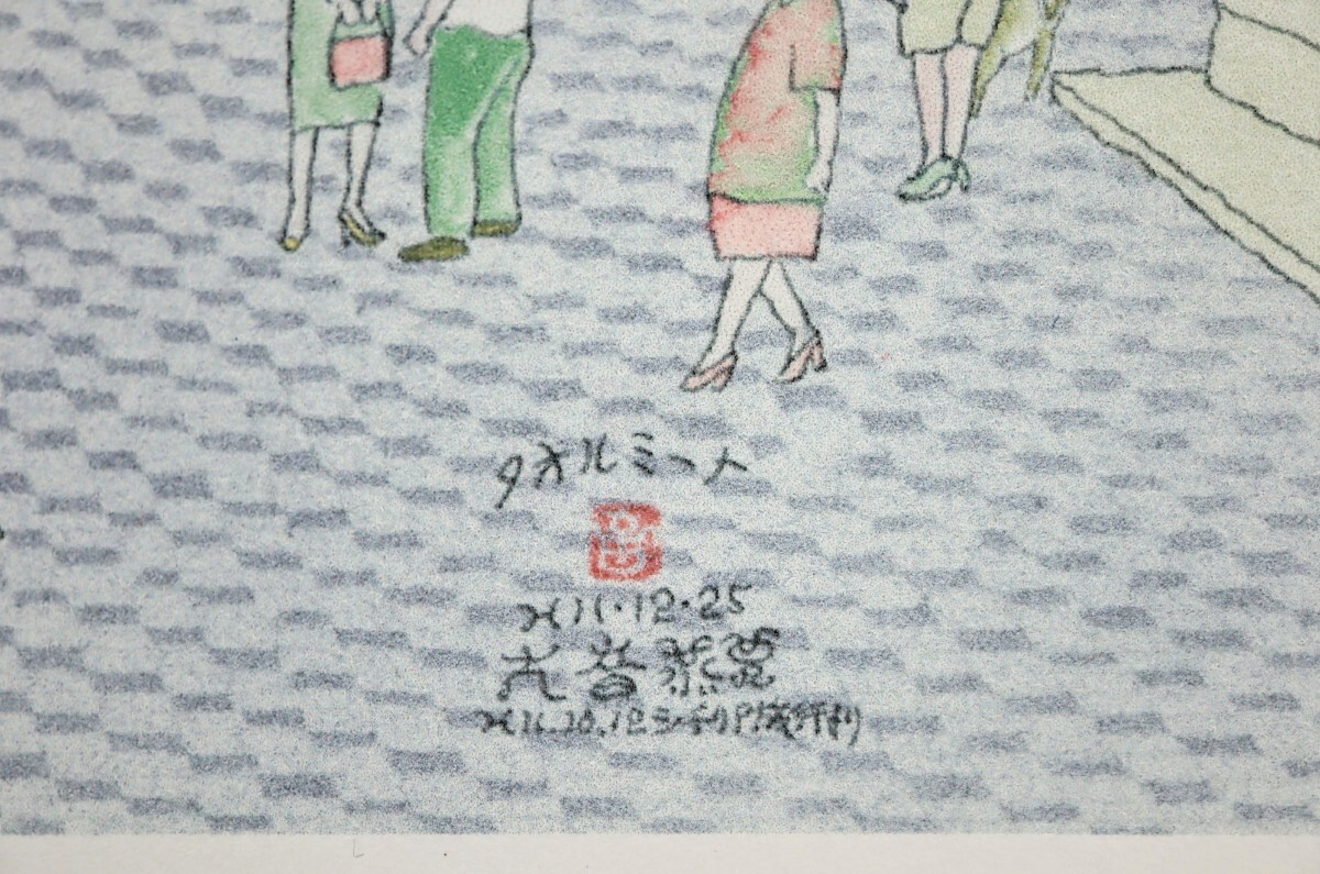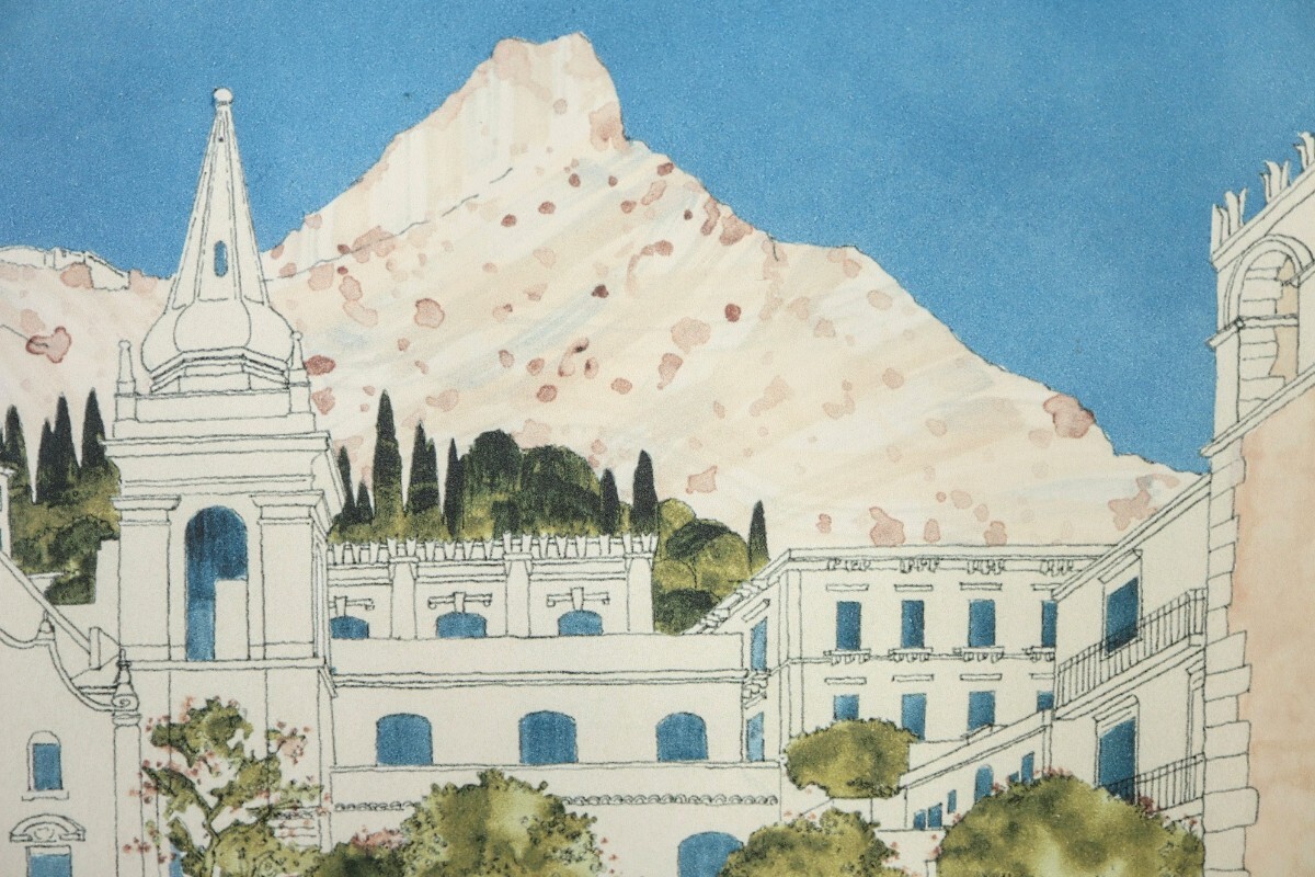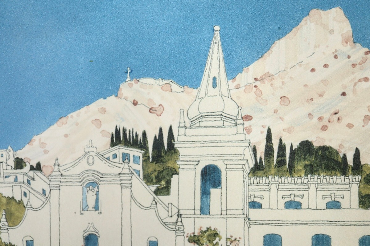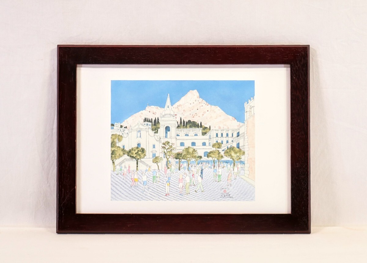 真作 大音恭豊 ジクレー「タオルミナ」画寸 19.5×16.5cm 兵庫県川西市住 イラストレーター 伊シチリア島 サン ジュゼッペ教会と広場 9696