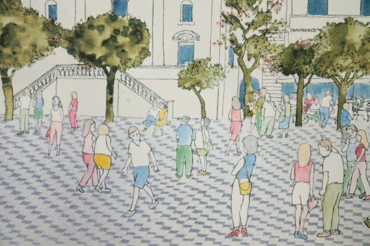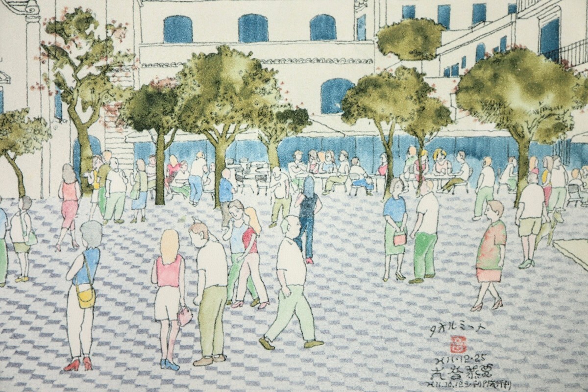 その前の大勢の観光客で賑わう広場を描いた風景です。