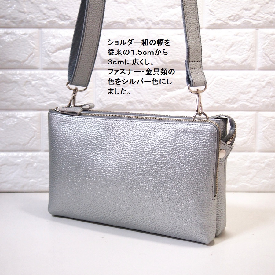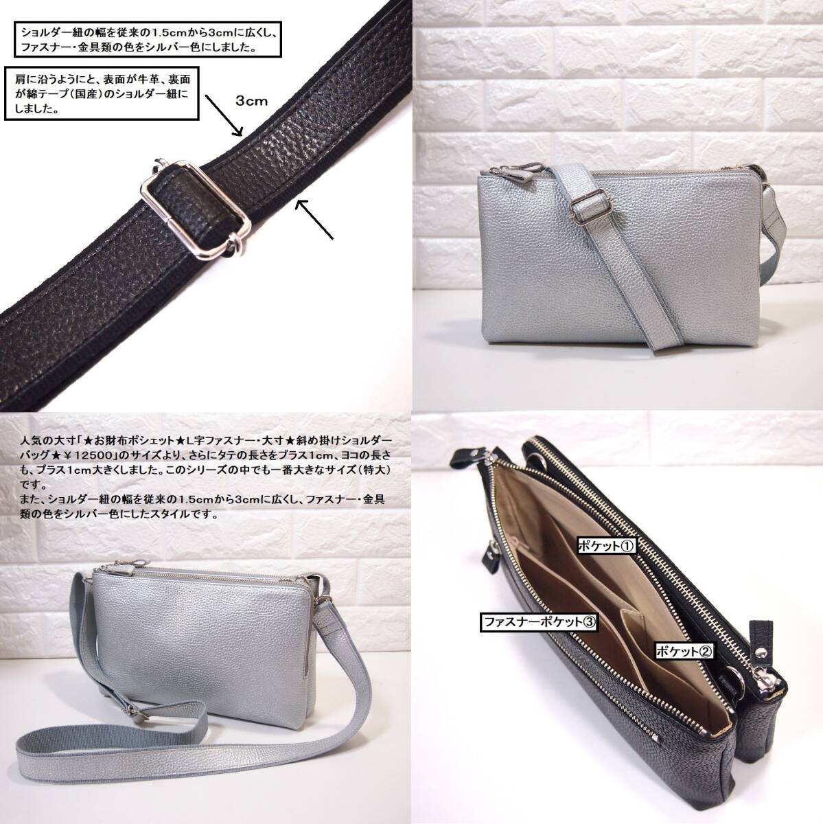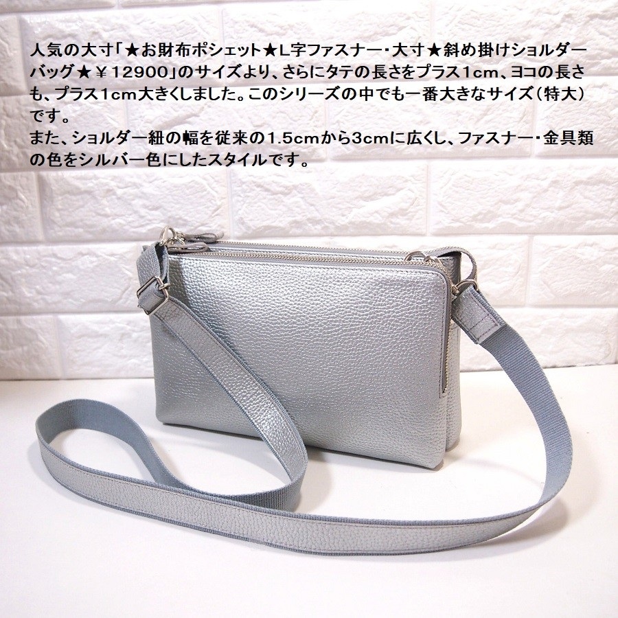 ★新品★日本製★本革★L字ファスナー・特大寸★斜め掛けショルダーバッグ★シルバー色★ショルダー幅広3cm★シルバーファスナー★