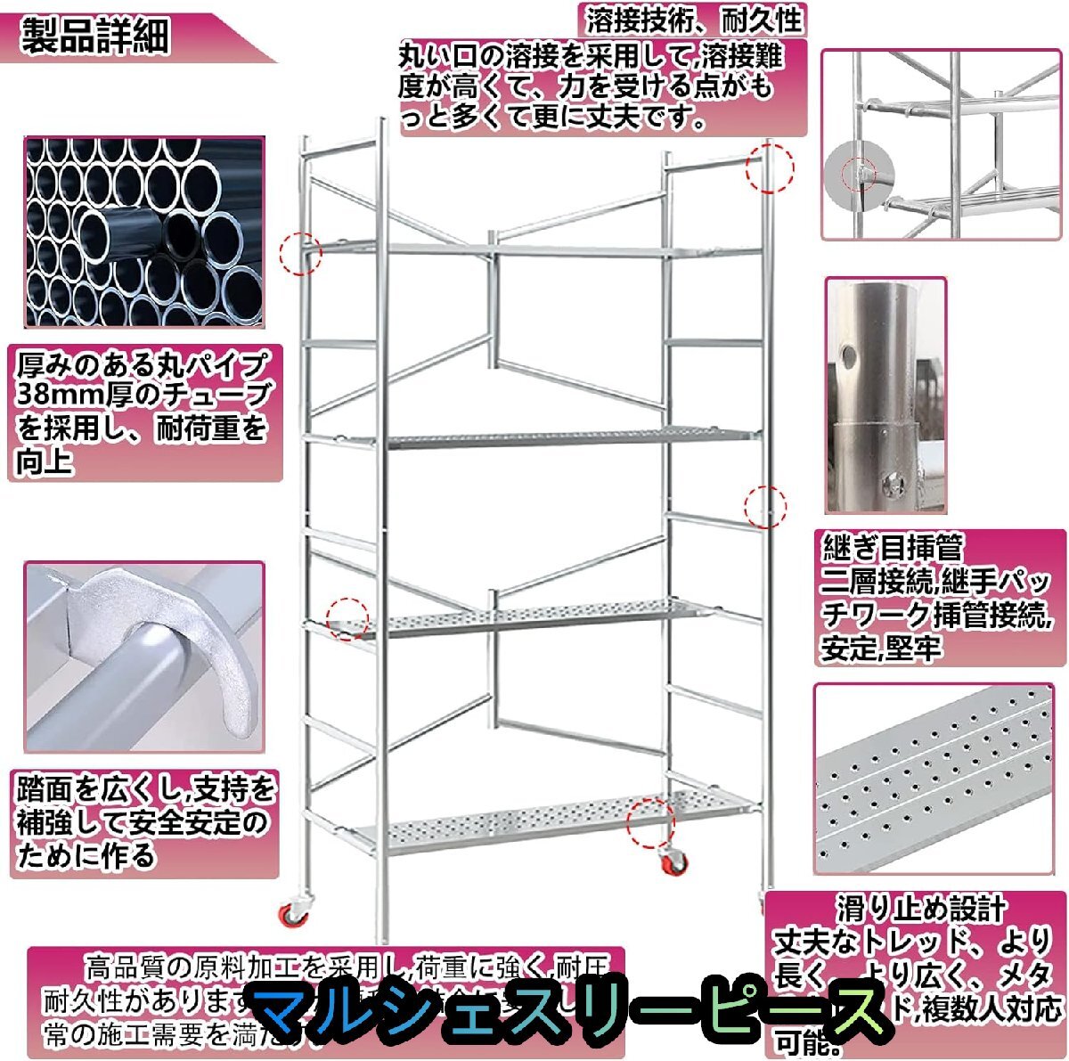 ★詳細 :【高品質な素材】当社の 足場 高さは自由に調整でき、高低両方で使用できます。同時に, 当社の 足場 は制品は亜鉛メッキから作られており、耐久性のある溶接プロセスは、全体のラウンド溶接は、サポートを強化し、強い荷重、その最大積載量は500キロに達するので、安全性の問題を心配することなく、複数の人々が同時に作業することができます。同時に、彼は2/4箇の方形のペダルを組み合わせて、あなたを施工して更にの便利させます。