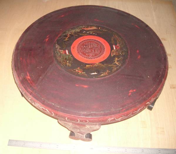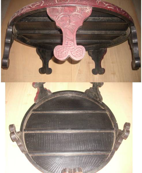 O○o。昭和レトロ 讃岐木彫机 螺鈿模様入 彫刻 丸机 年代物貴重!