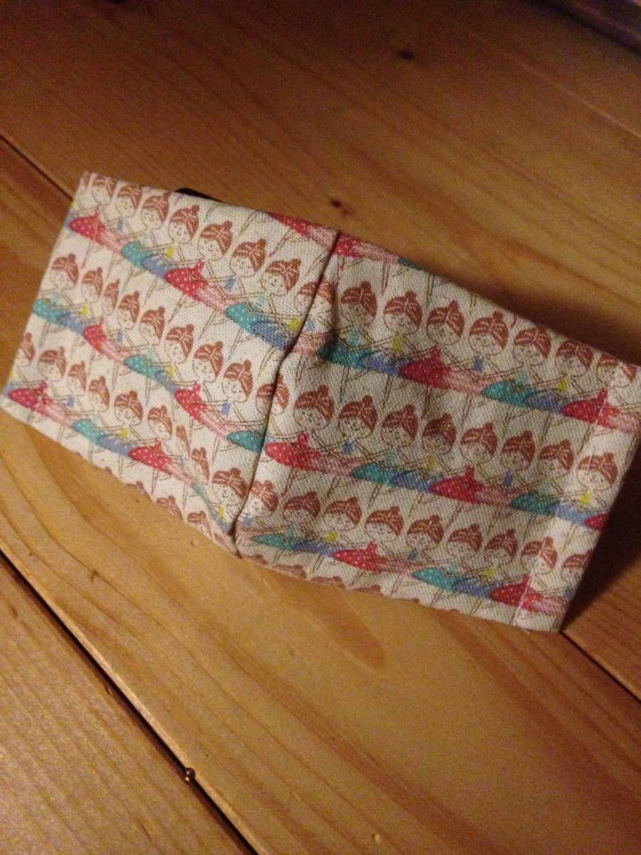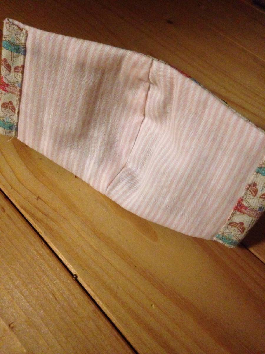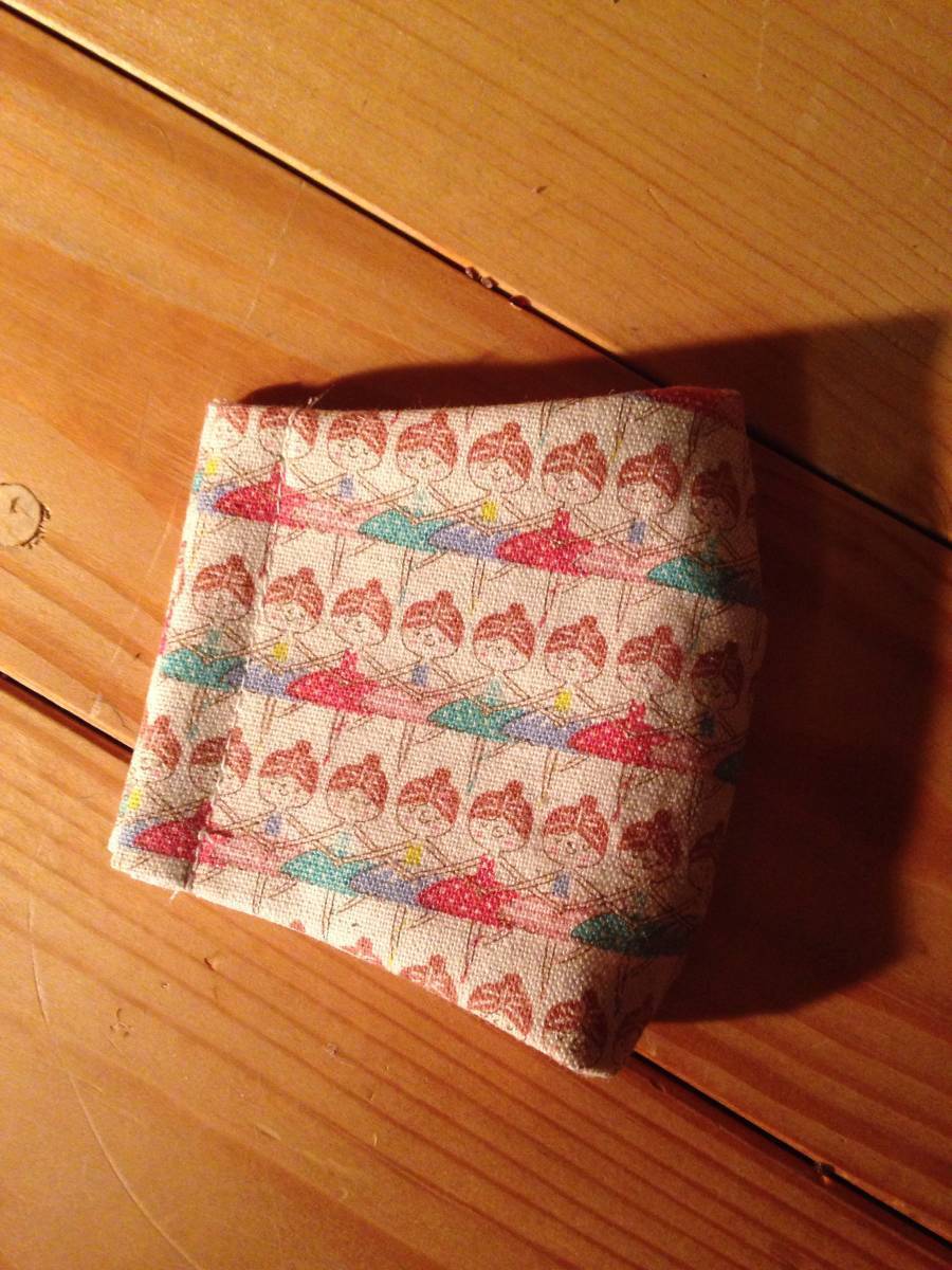 かわいいバレリーナ柄の綿麻キャンバス地で、裏地はピンクストライプのダブルガーゼです。