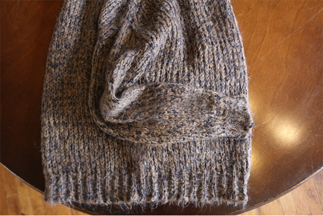 お色はブラウンよりのチャコールのニットにネイビーが縫い込まれております。
