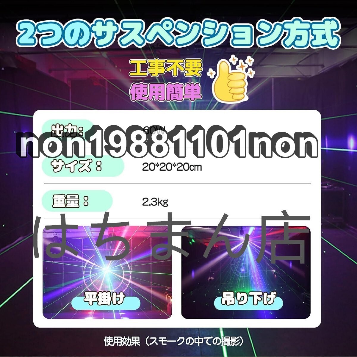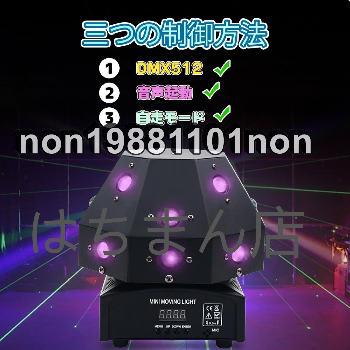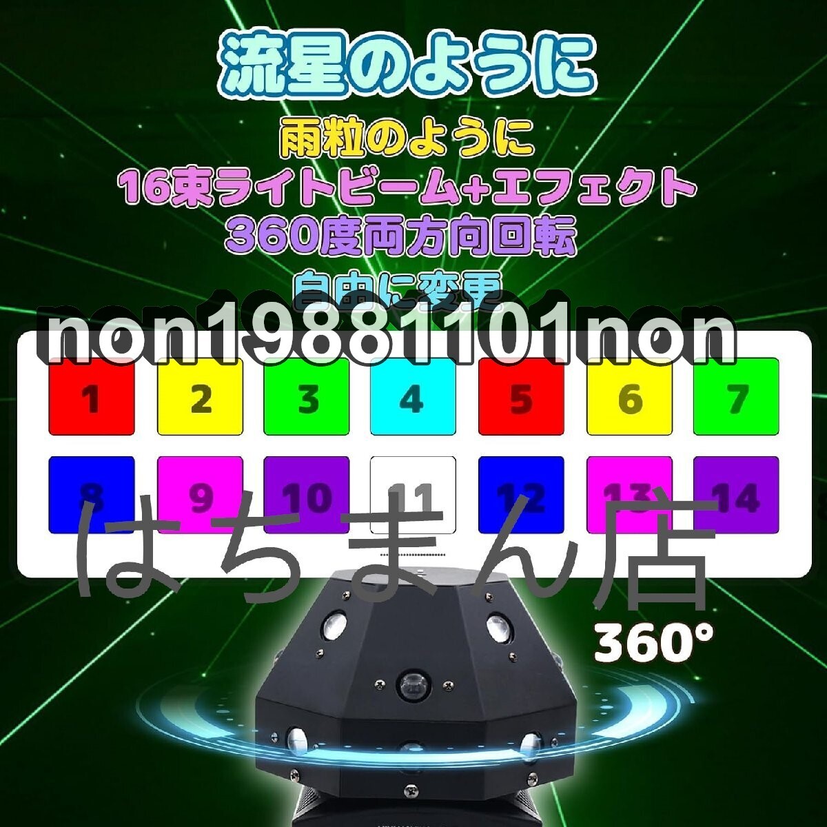 ●商品未使用 状態:新品未使用 16束ライトビームにグリーンエフェクトに加えて、ステージで彩る演出を提供するステージライト。鮮明なパターンや高品質な色合いを採用、動的な演出を実現します。 両方向360度回転可能、空間の隅々まで照らせます。多彩なカラー表現が可能、没入感抜群で、雰囲気作りに欠かせないアイテムです。 DMX512調光操作卓に対応。音声/自動制御モード搭載。激しいロック、ソフトなクラシック音楽、色んな音楽のリズムによってパターンが変化し、自在動的な演出が行えます。 高照度・長寿命で安定性に優れた多機能舞台照明ライト。小規模空間で高品質な色合いを実現します。 安全でスマート化なライティング。ワンポイントのライトビームを避けられます。室内・ライブ会場・クラブ・パーティーなど色んな環境に適用しています。
