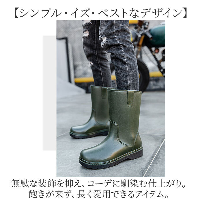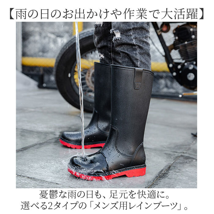 | 商品説明 | ・・【雨の日のお出かけや作業で大活躍】 ・憂鬱な雨の日も、足元を快適に。選べる2タイプの「メンズ用レインブーツ」。 ・【シンプル・イズ・ベストなデザイン】 ・無駄な装飾を抑え、コーデに馴染む仕上がり。飽きが来ず、長く愛用できるアイテム。 ・【どこでも脱ぎ履きスムーズ】 ・すぽっと足を入れるだけ。履き口が大きく開き、脱ぎ履きに手間取らない◎ ・【屈曲性があり、歩きやすさが向上】 ・つま先部分は、足の動きに合わせて柔軟に曲がる上向き形状。蹴り上げやすくつまずきにくい! ・【取り外せて衛生的なインソール】 ・インソールは取り外し可能。しっかり乾かせるから、いつも清潔をキープ◎ ・【滑りにくく安定感のあるソール】 ・底面に凹凸を施した滑りにくい仕様。1歩1歩しっかり進めて、安定した歩行をサポート。 ・【水に強くお手入れ簡単】 ・表面は水に強い素材で、雨の日の相棒に最適。お手入れも拭き取るだけ。 ・(※)完全防水ではありません。 ・【お好みやシーンに合わせてチョイス】 ・タウンユースや、強い雨や雪の日、農作業などにも! ・【ボトムスをインしておしゃれに】 ・細めのボトムスをブーツインすれば、スタイリッシュにキマる!色んなシーンでヘビロテ。 |