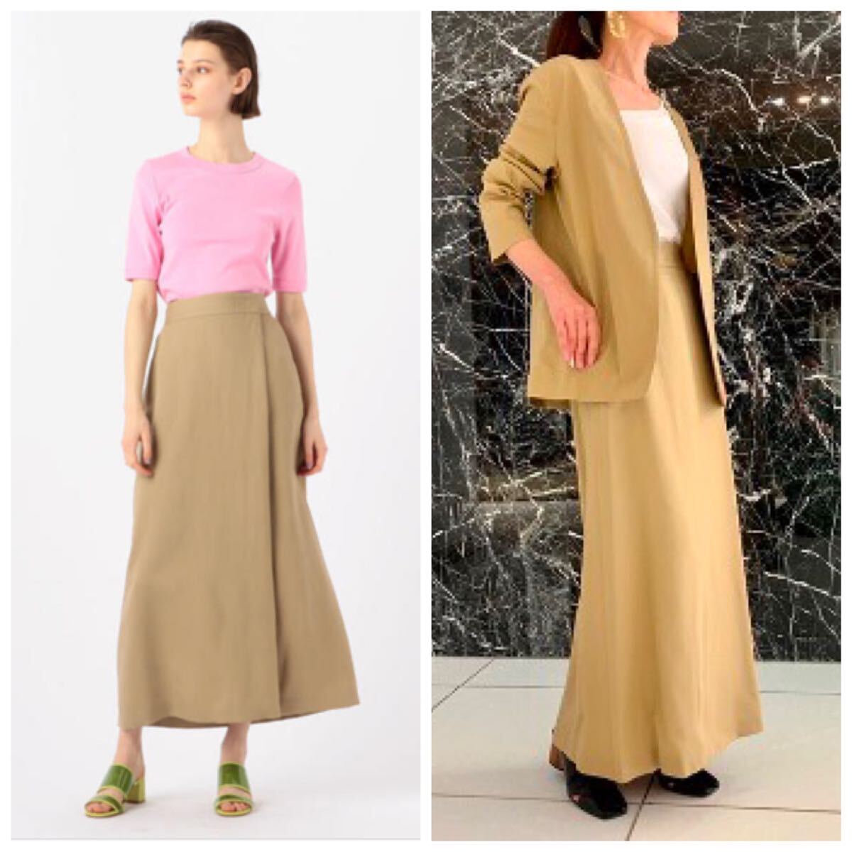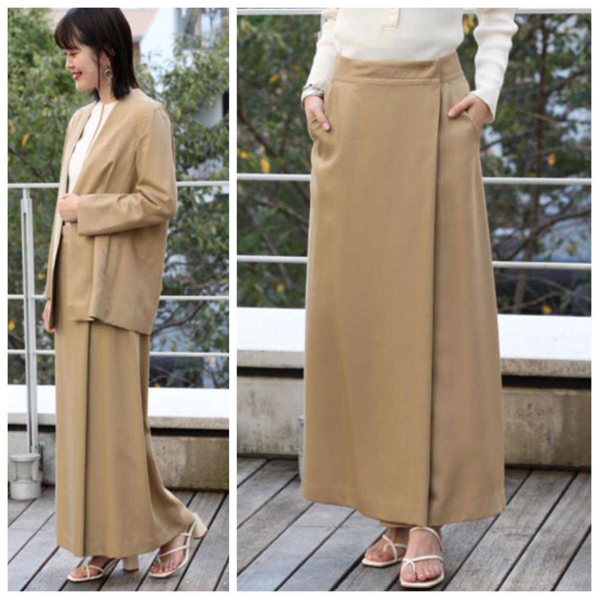 スカートはマキシ丈と緩やかなAラインシルエットでクリーンかつ女性らしい印象の一着です。