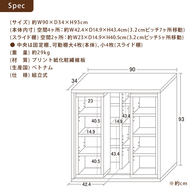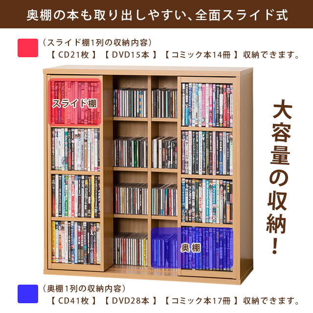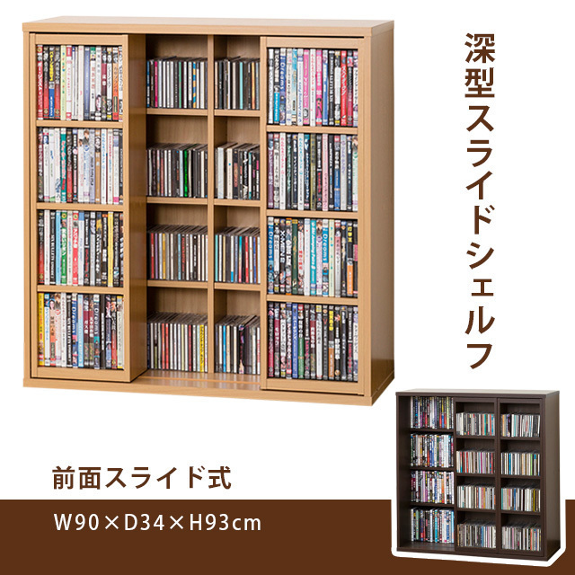 商品説明 | 深型スライドシェルフ ブラウン(BR) 落札後、最初の連絡で配達伝票に記載する電話番号をお尋ねします 後ろの棚の本も取り出しやすい、全面スライド式。CD・DVD・コミックが、大容量に収納できる! ●前面・後面に分かれて収納できる、前面スライド式本棚。 ●奥の棚1列に(CD41枚)、(DVD28本)、(コミック本27冊)収納可。 ●スライド棚1列に(CD21枚)、(DVD15本)、(コミック本14冊)収納可。 ●連結金具付で、2台積み重ねることもできます。 商品詳細 サイズ・容量 【商品サイズ】約 横90×奥行34×高さ93cm 【本体内寸 (空間4ヶ所) 】約 横42.4×奥行14.9×高さ43.4cm (3.2cmピッチ7ヶ所移動) 【スライド棚内寸 (空間2ヶ所) 】約 横23×奥行14.9×高さ40.5cm (3.2cmピッチ5ヶ所移動) 【可動棚】中央は固定棚、大4枚 (本体)、小4枚 (スライド棚) 【重 量】約 29kg 【梱包サイズ】約 95×37×20cm 【梱包重量】約 30kg 規格 【材 質】 プリント紙化粧繊維板 【仕 様】組立式 【生産国】ベトナム ブラウン(BR)専用ページです、ナチュラル(NA)も有りますが別ベージとなってます。 (1枚目の写真は取扱いカラー全色を載せていますが、専用ページカラー以外の画像は参考として下さい) カタログ価格19000円 |