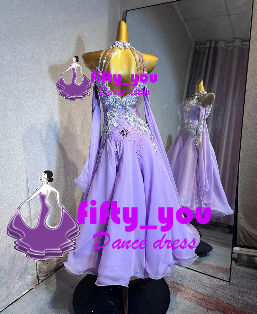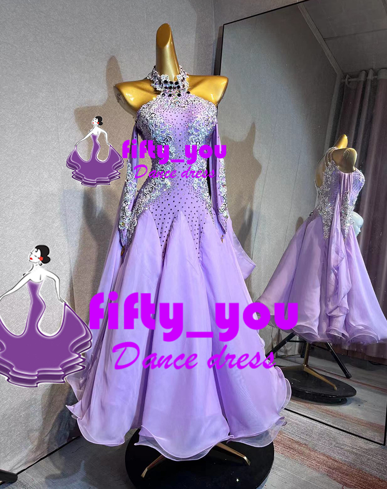 新品fifty_you レディース社交ダンスドレス  モダン競技会ドレス 可愛いモチーフ飾り セミオーダー 高級品 紫色 グローブフロート