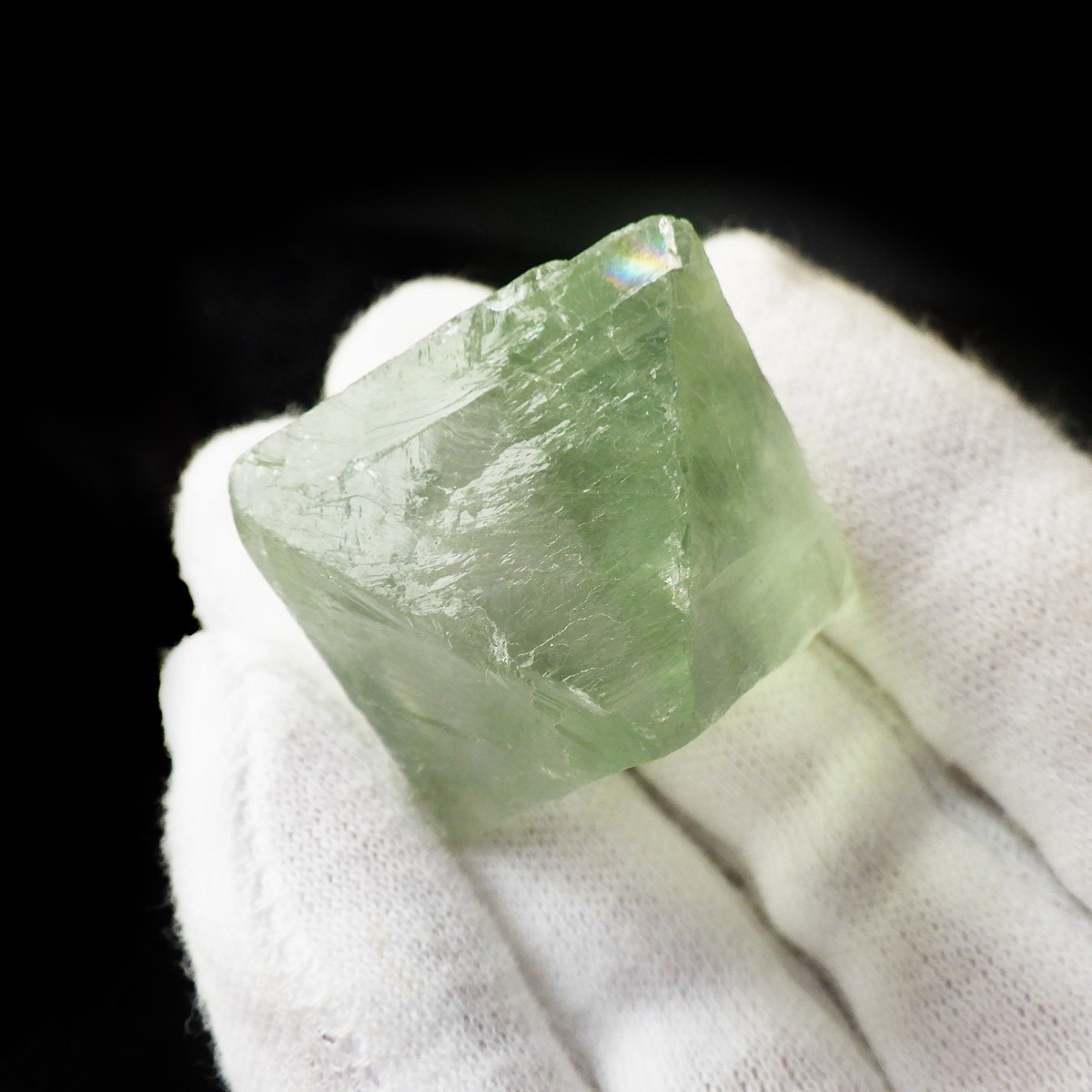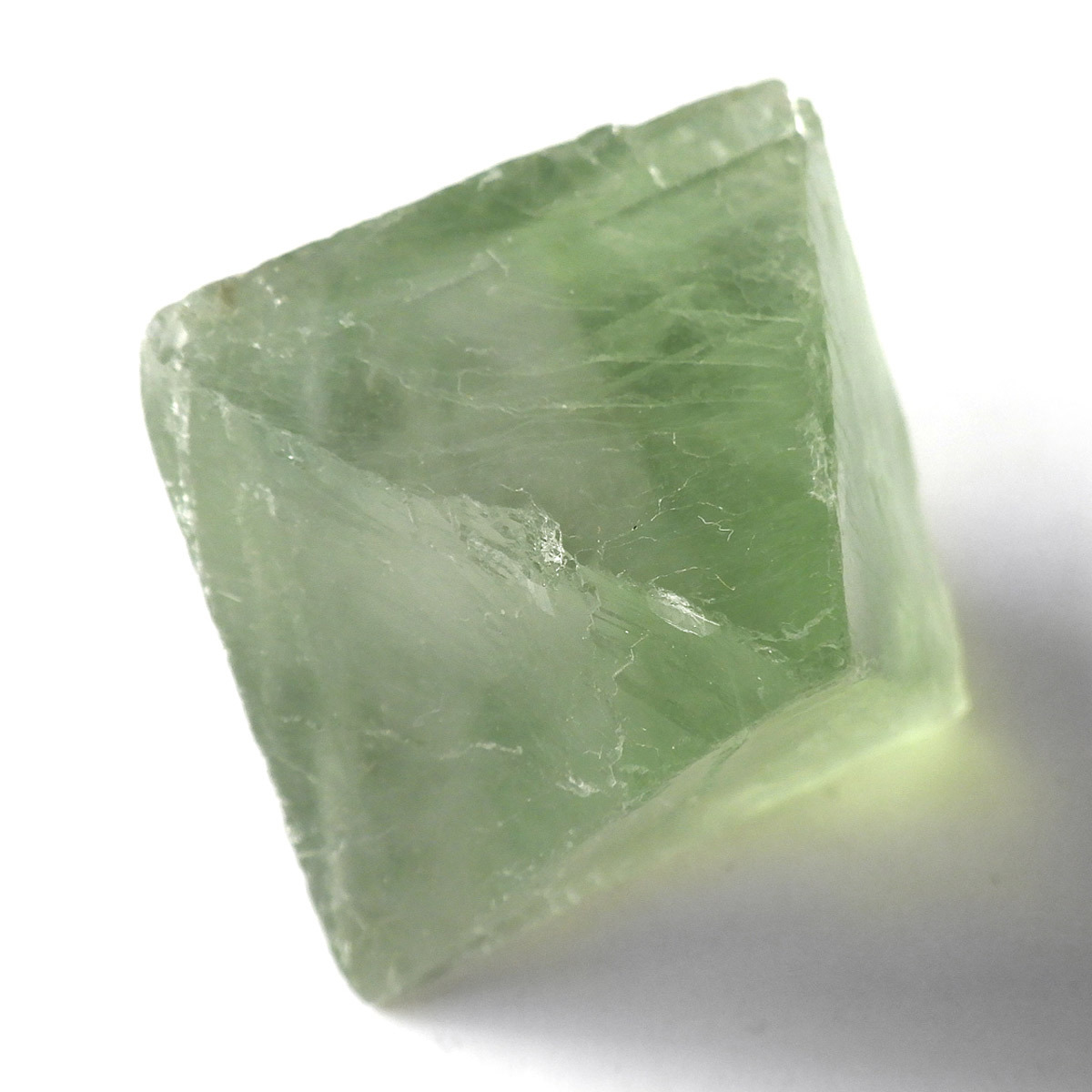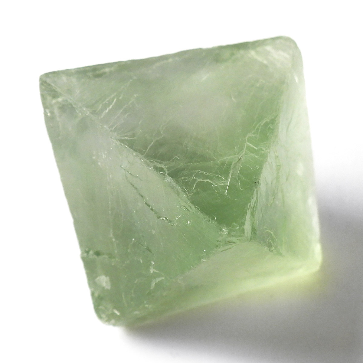 チャイナ産の八面体フローライトです。この正八面体の形は、蛍石が平面に平行に割れやすい性質を利用して加工したものです。光に透かすと一層の美しさです。