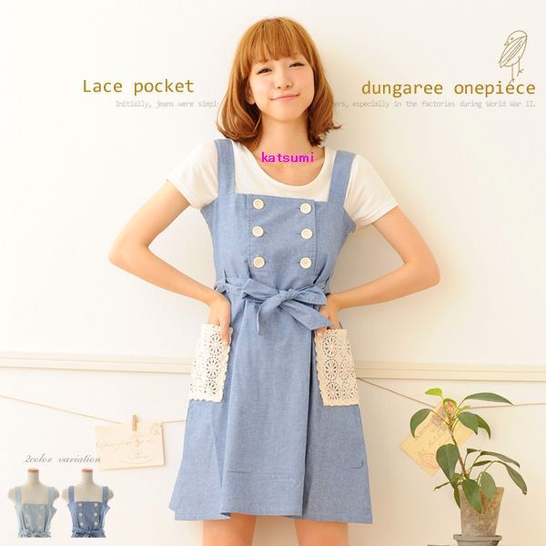 かぎ編みレースポケット☆前結びできちゃうタンガリーワンピース