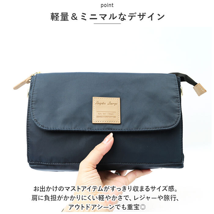 | 商品説明 | ・・色んなシーンでマルチに活躍!Legato Largoから、撥水ナイロン製のサイフ機能付ショルダーが新登場。 ・【軽量&ミニマルなデザイン】 ・お出かけのマストアイテムがすっきり収まるサイズ感。肩に負担がかかりにくい軽やかさで、レジャーや旅行、アウトドアシーンでも重宝◎ ・【ファスナー開口】 ・メインルーム開口部は、開閉がスムーズなファスナー式。中身が飛び出すことなく、プライバシーを確保。 ・【スリムなマチ設計】 ・身軽に持ち歩けるスリムなつくり。エチケットグッズやミニサイズの手帳なども、すっぽり収まる! ・【便利なお財布機能を搭載】 ・フロントのマグネットフラップを開くと、仕切り&ポケット付きのルーム。現金やカードを収納できて、お財布代わりに♪ ・【サッと取り出せるポケット】 ・背面にもポケットを配置し、小物が迷子になりにくいのもポイント。 ・【使い方自在】 ・長さ調節可能なショルダーベルトを取り付けて、肩掛けや斜め掛け。ショルダーを取り外して、バッグインポーチとして使ってもOK。 ・【ちょっとの雨なら大丈夫】 ・表面に水滴や汚れを弾く、はっ水加工済み。お手入れも拭き取るだけ!(※完全防水ではありません。) ・【選べるカラー】 ・落ち着きのあるカラーをラインナップ。コーデを選ばず使える、シンプルなデザインも魅力。フロントタグなど、合皮使いがアクセントに。 ・【ポケット仕様】 ・前面フラップポケット:メッシュポケット×2、ファスナーポケット×1、フリーポケット×4、カードポケット×4 ・背面:オープンポケット×2 |