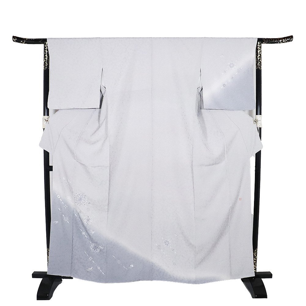 | 山口美術織物謹製 訪問着 袷 丹後縮緬地 ライトグレー(白梅鼠色)・グレー紫(藤鼠色)暈し地 花紋地模様地 総刺繍・華文・唐花 169 広襟 落款入り 新品 仕付け付き |