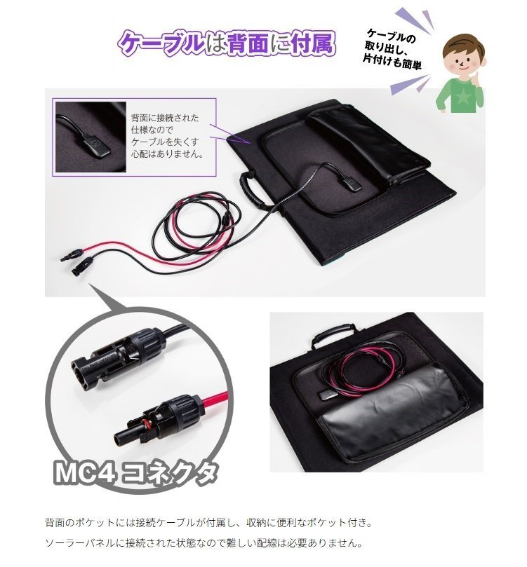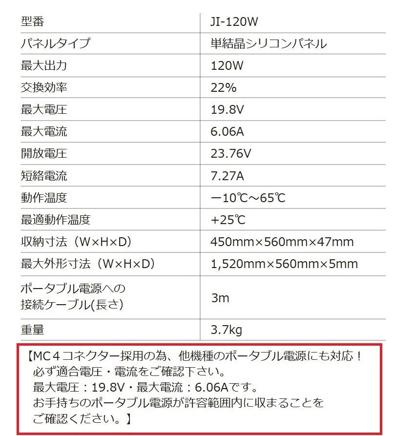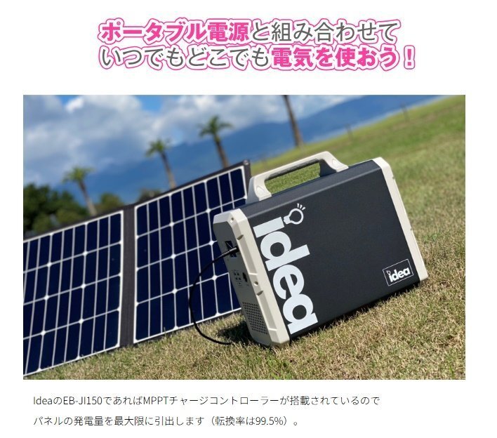 【 ここがポイント 】 ◆税込定価35,200円を、在庫限りの特価でお届け! ◆EB-JI150はもちろん、M4コネクター採用で他機種のポータブル電源にも対応(※最大電圧:19.8V、最大電流:6.06Aでお手持ちのポータブル電源の許容範囲内に収まることを確認してください。) ◆世界最高レベルの交換効率、3.7kgと軽量の為持ち運びが楽で、ポータブル電源とコンビでキャンプ・アウトドア、防災用品として役立ちます。