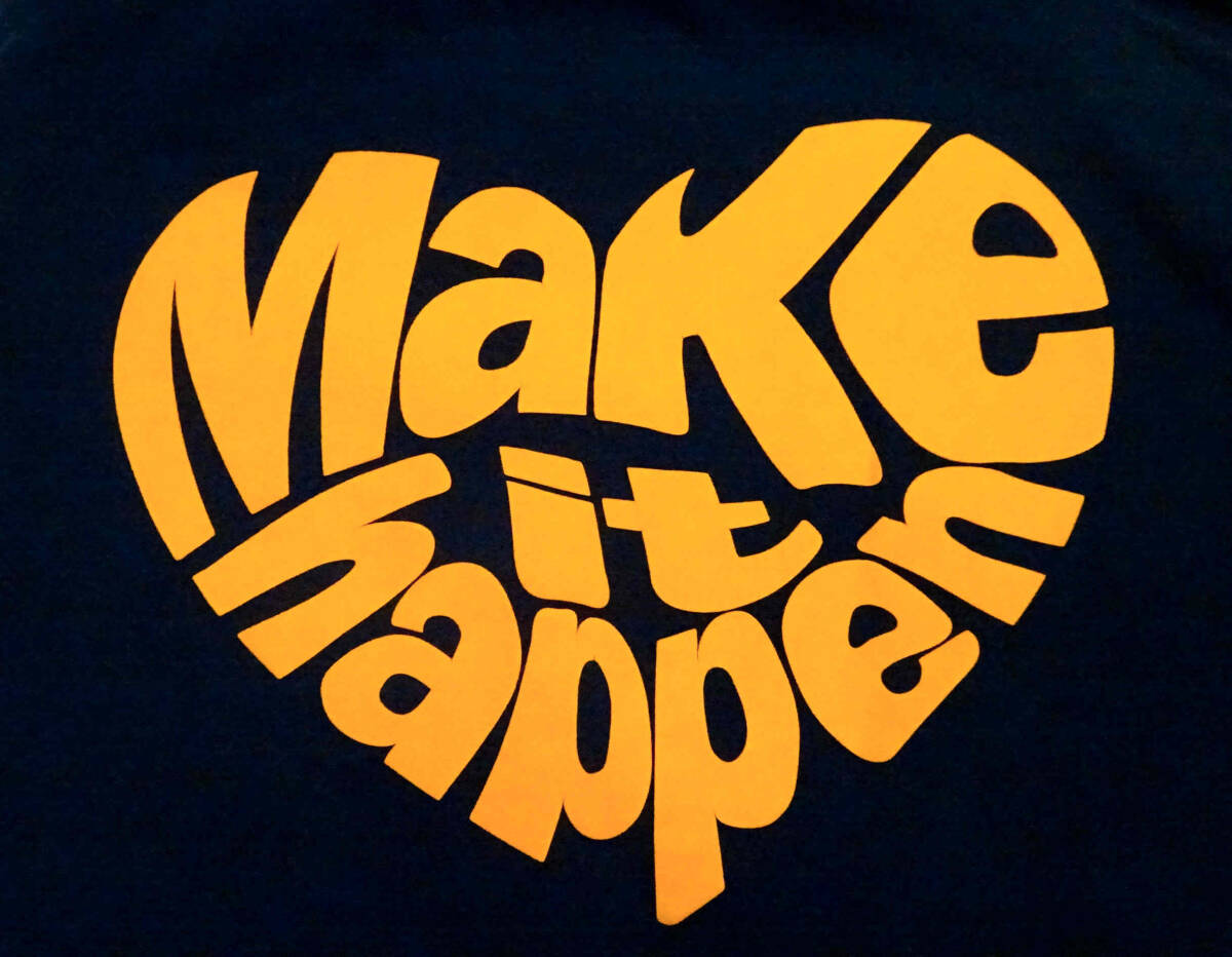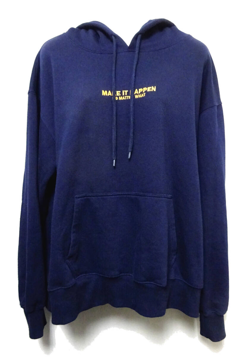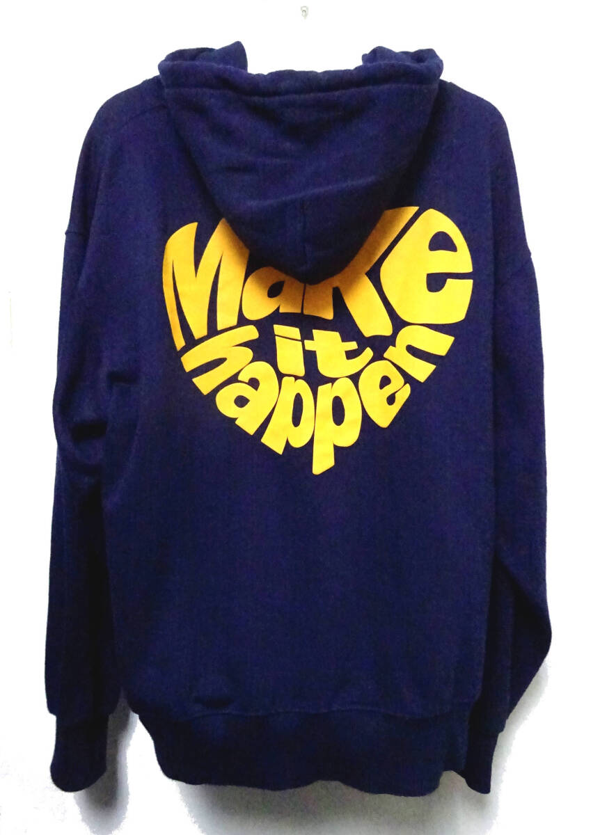 | カラー | ●ネイビーブルーの地に、MAKE IT HAPPEN NO MATTER WHATの文字がゴールドの糸で刺しゅうされ、後ろにもMAKE IT HAPPEN(実現させる)の大きな文字がオレンジ色でプリントされています。 |