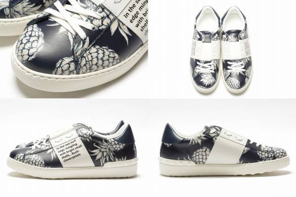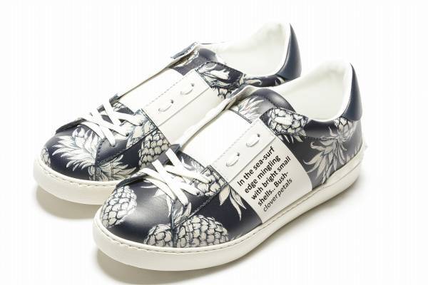 パイナップルプリントを施したカーフスキン製のアッパー、中間のラインサイドには「in the sea-surf edge mingling with bright small shellsbush-clover petals」のフレーズが記され、たいへんオシャレなスニーカーです。フロントはシューレースが表に出ないオープンタイプ、アッパーとソールの間の踵部分にはラバー製のスタッズを施したデザインが映えます。