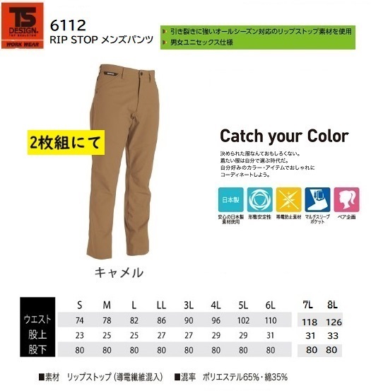ビックイナバ特価◆TSDESIGN 6112 RIP STOPメンズパンツ【65キャメル・4Lサイズ】定価1枚7480円の品が、2枚組で即決2980円