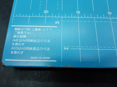 ・動作確認のためにコピー用紙を裁断し切れ味に違和感は感じませんでしたが、経年によりサビのような汚れが確認できます。