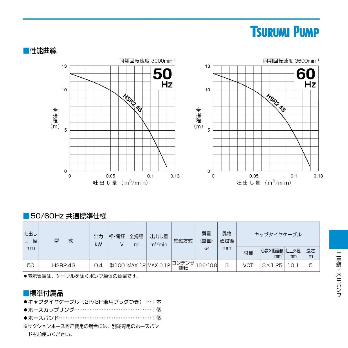 〈ツルミ〉HSR2.4S 60Hz 西日本用 一般排水用 水中ハイスピンポンプ HSR型 口径50mm 出力0.4kw 低水位排水仕様 ツルミポンプ 代引不可
