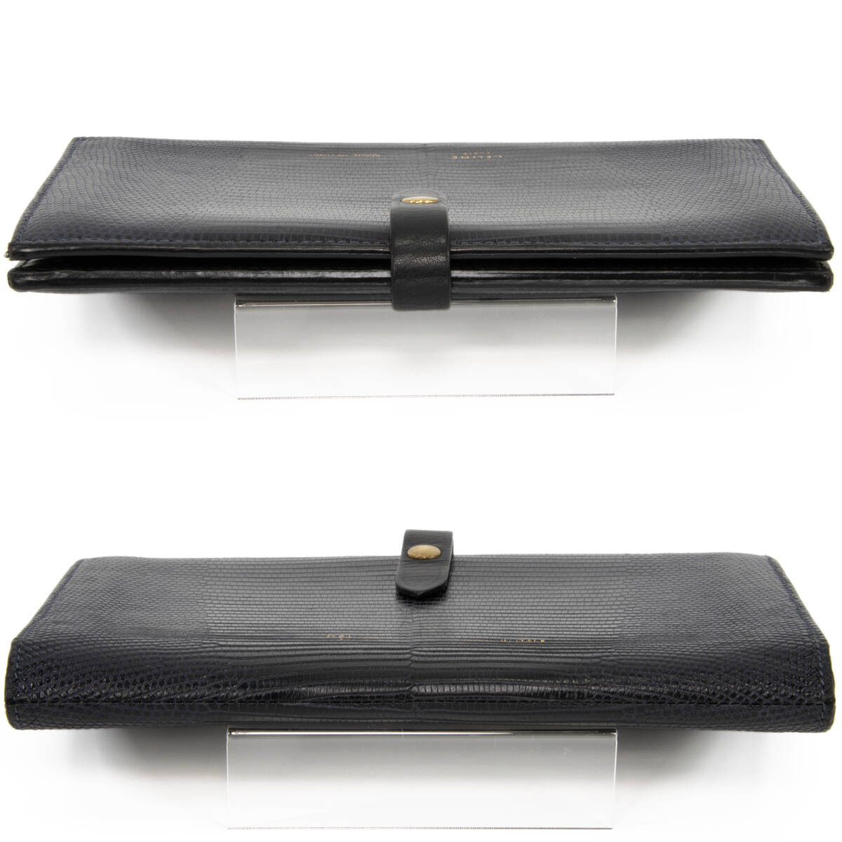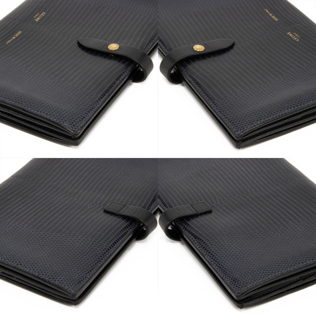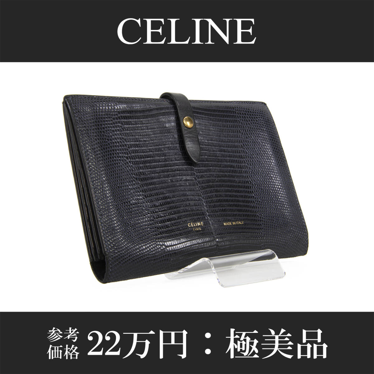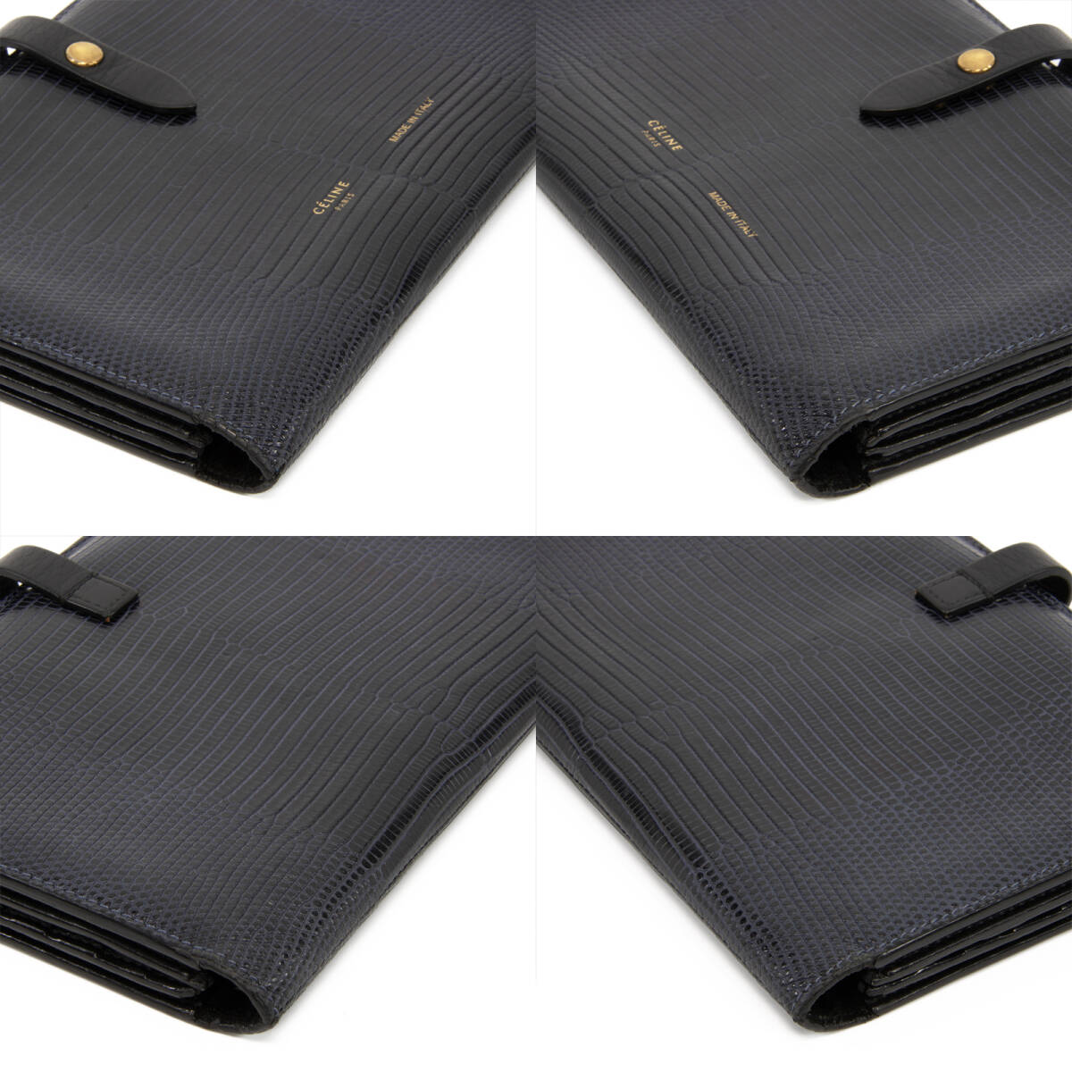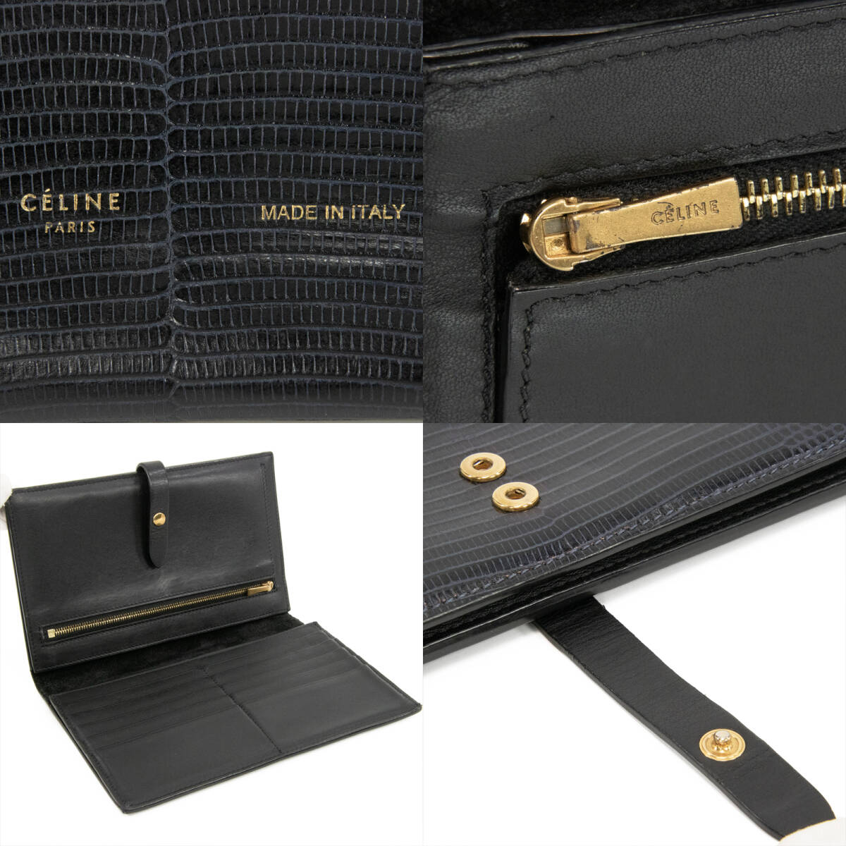 本物 送料無料 セリーヌ 長財布 レディース リザード ラージストラップウォレット ネイビーブルー ブラック ゴールドロゴ マーク 綺麗 D176