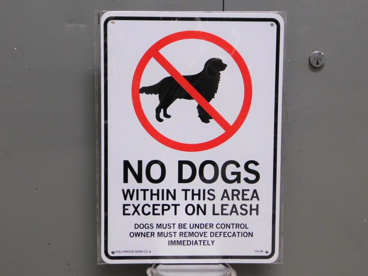 「このエリア内は、犬のノーリード禁止。飼い主が管理する必要があり、排便は直ちに取り除いてください。」と書いてあります。