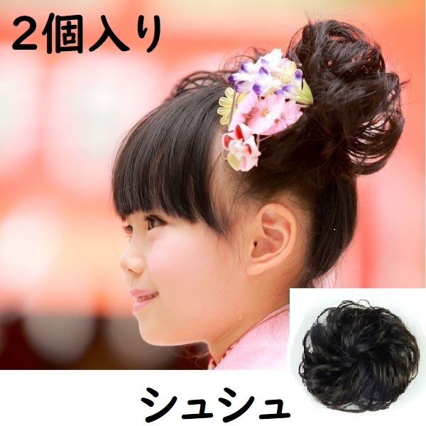 送料無料 2個セット シュシュ 黒髪 黒色 付け毛 女性 子供 七五三 No.731 E