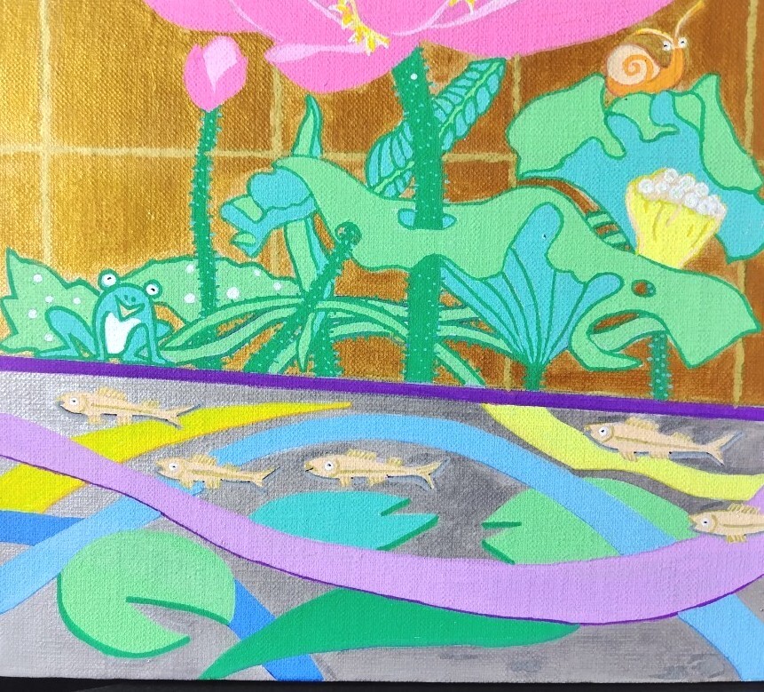 地上の蓮花には蛙と蝸牛が憩い、水面には睡蓮の葉が浮遊し、水中には魚が群泳します