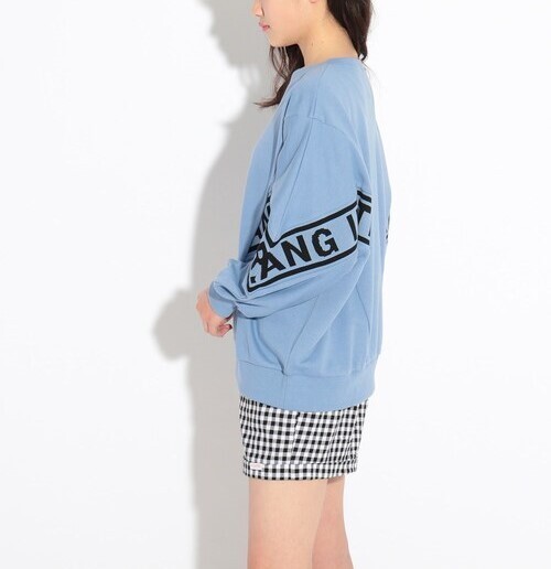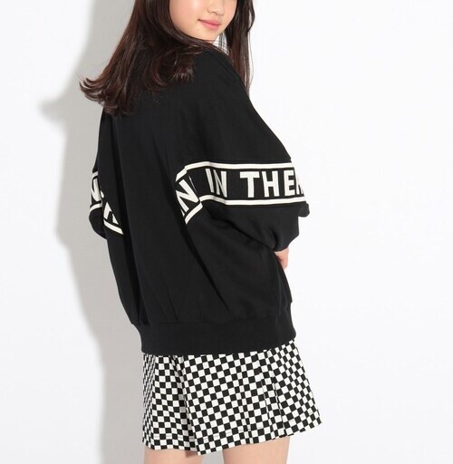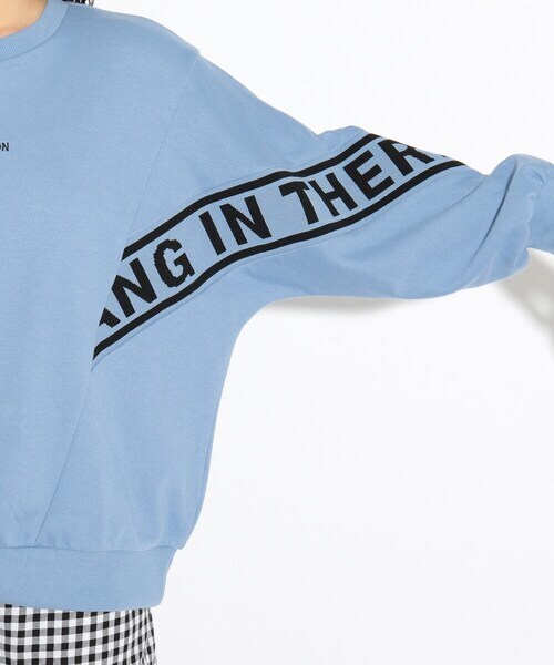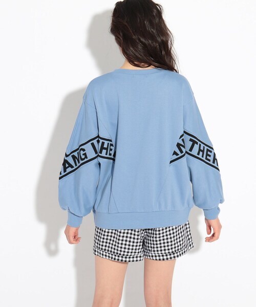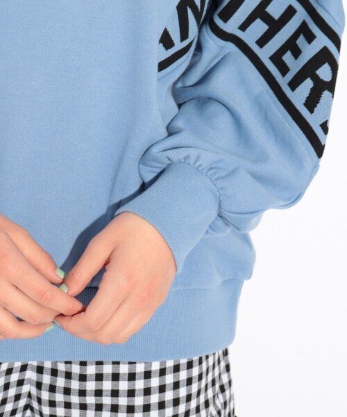 ボリュームのあるドルマンスリーブにジャカードのロゴを斜めに配したプルオーバーです。
