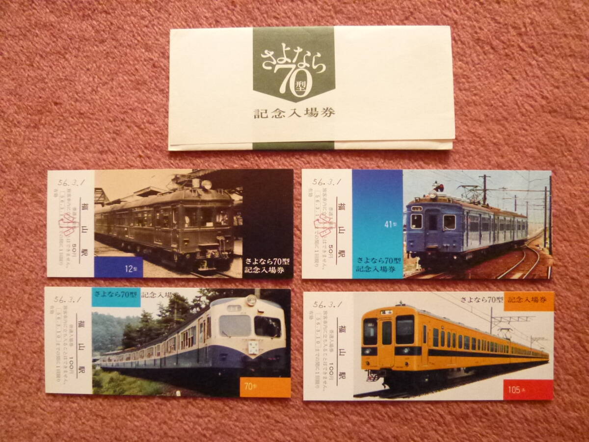 さよなら70型記念入場券4枚1組(国鉄/岡山鉄道管理局/福塩線/福山⇔府中/湘南電車/クモハ41型/クモハ12型/クモハ105型/昭和56年3月1日)