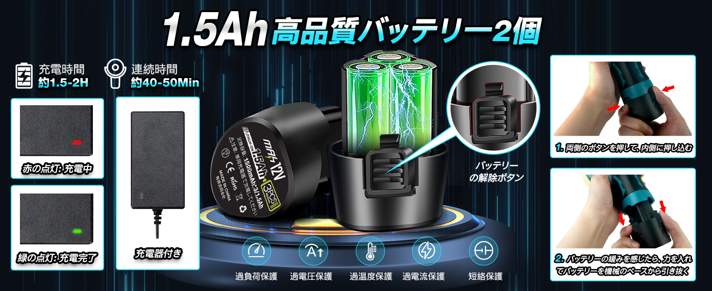 ▲【1.5Ahバッテリー2個付属★残量表示】12V1.5Ahの大容量バッテリーが2個付属しており、交互に使用でき、作業途中でバッテリーが切れる心配がなく便利です。通常2時間でフル充電でき、フル充電すれば40分以上使用できます。ポリッシャー本体には残量表示ライトが付いており、スイッチを長押しして起動すると同時に、3段階の残量表示ライトが点灯します。バッテリーはどのくらい容量があるか一見だけで分かって安心します。また、充電状態表示LEDが搭載されています。充電中はLEDが赤色に点灯し、充電が完了するとLEDが緑色に点灯します。注意:バッテリーを取り外すときは、バッテリーの2つのレリーズボタンを上に向け、2つのレリーズボタンをしっかりと押してから、バッテリーを機械のベースから引き出します。初めて使用するときは、バックルがきつすぎて取り外しにくい場合があります。 3~4回インストールを繰り返すと正常に戻ります。