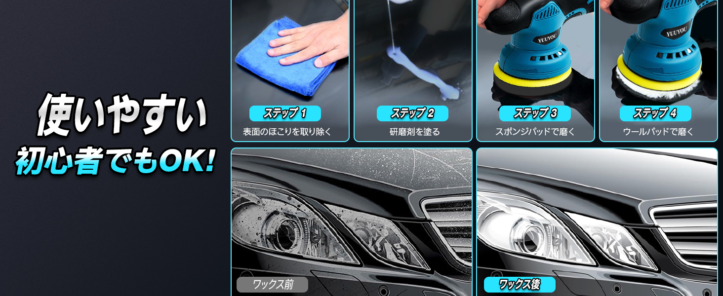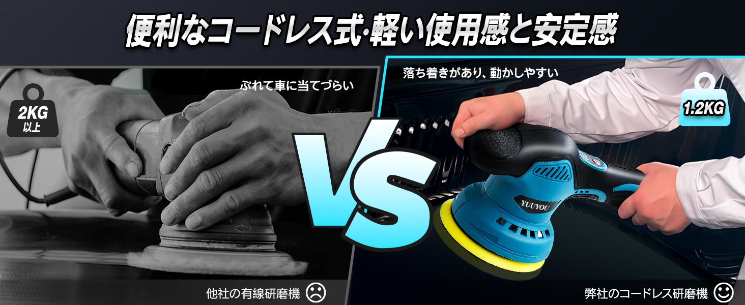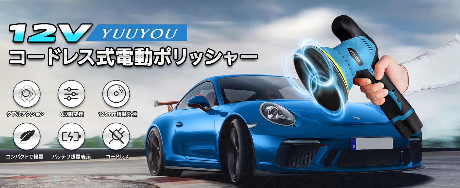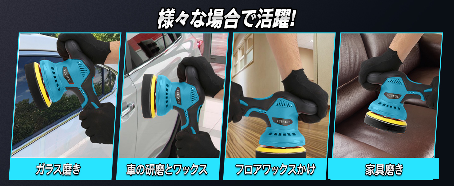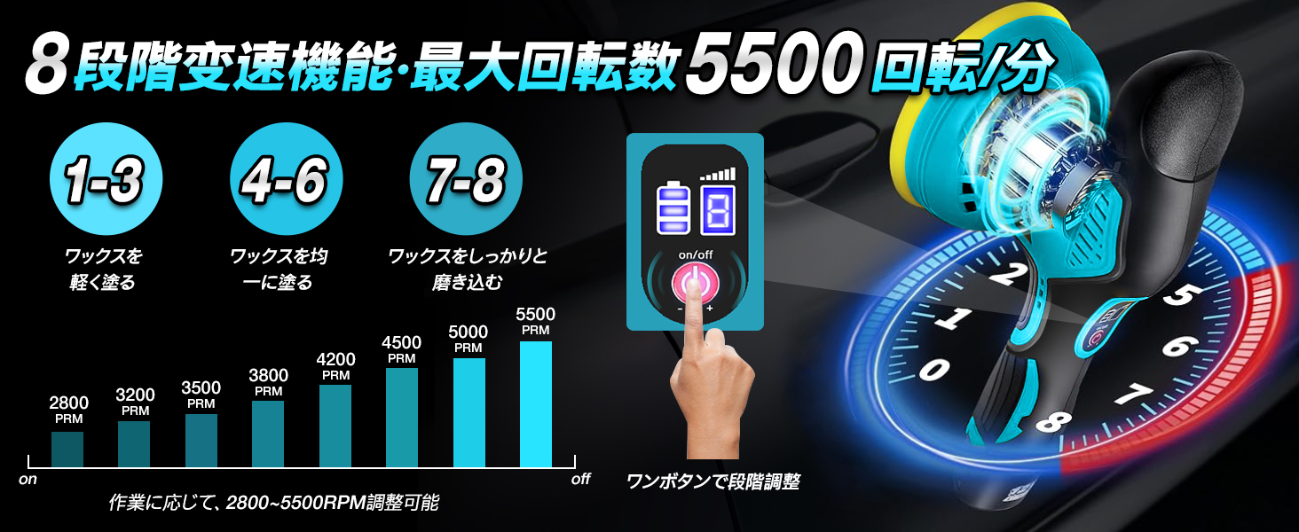 和式研磨バフが装備されており、日本車により適しています。 PL保険加入済みの製品ですので、安心してご使用ください。▲【8段階変速可能★偏心構造】従来の2段階変速製品に比べる8段階の変速にアップグレードされ、研磨シーンに応じて細かく変速できます。ポリッシャーの操作も簡単でスイッチを長押しすれば起動し、一回押すごとに速度が1段階上がります。作業内容に合わせて回転数は2800rpmから5500rpmの範囲で調整可能です。ポリッシャーは新しい偏心構造の回転方式を採用し、不規則な研磨経路を使用しており、より広いポリッシング面積と強力なポリッシング力を提供します。傷のあるペイント面をカバーし、作業効率を大幅に向上させ、作業時間を短縮します。また、過熱の心配がないように、複数の放熱口も設計されています。(変速段階:1-3段階はワックスを軽く塗る。4-6段階は均一にワックスを塗る。7-8段階はワックスをしっかりと磨き込む)