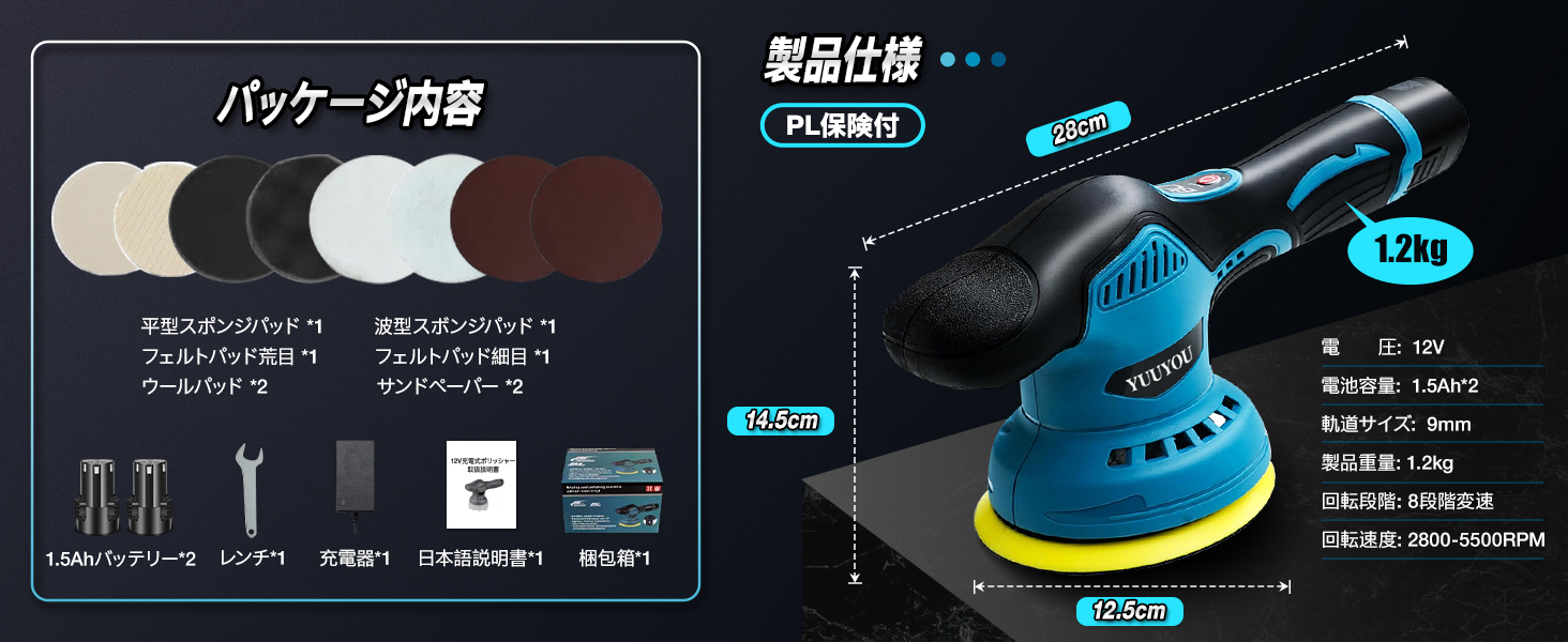 ▲【パッケージ内容】セット内容:12V充電式ポリッシャー*1、1.5Ahバッテリー*2、和風ウールパッド細目*1、和風ウールパッド荒目*1、波型スボンジパッド*1、平型スポンジパッド*1、ファイバーパッド*2、サンドペーパー*2、日本語説明書*1。本体重量:1.2kg、サイズ:28*14.5*12.5cm。