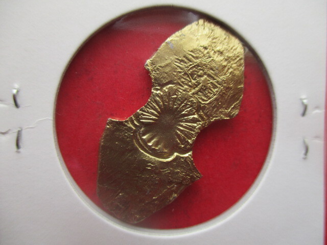 室町時代後期に鋳造され、臣下に嫁ぐ姫君に将軍から下賜された姫分銅金は、次の江戸時代にも引き継がれました。江戸期の作では、はなむけの漢字が裏に刻まれ、それによって鋳造した代が特定されるとのことです。