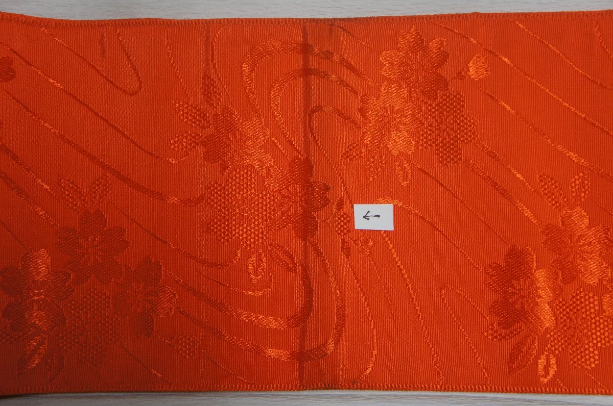 帯柄附全通柄 化繊朱色地流水桜花地紋朱色地一本縞