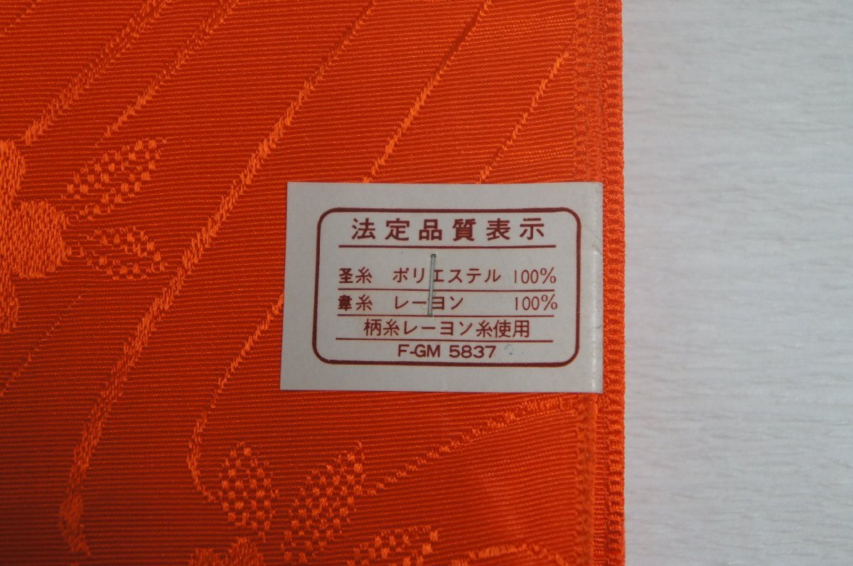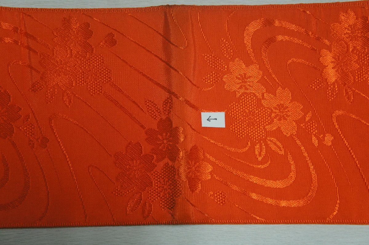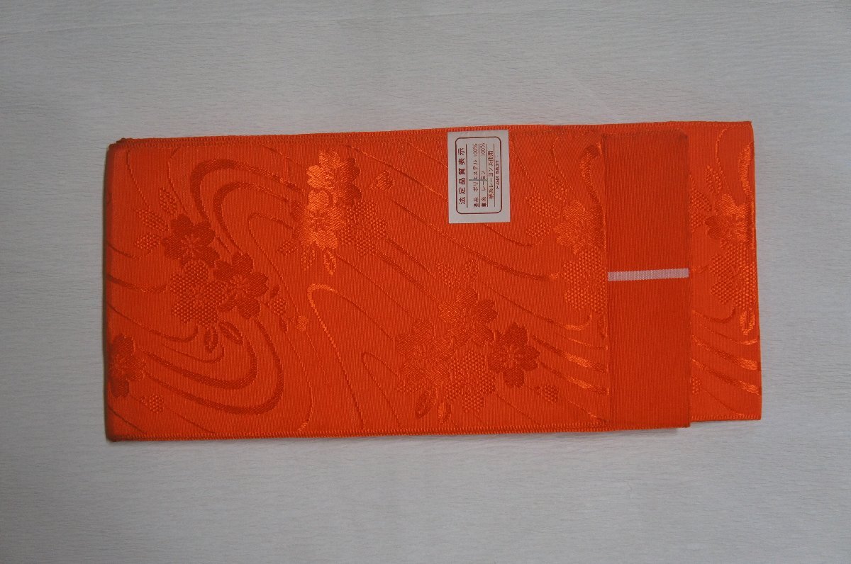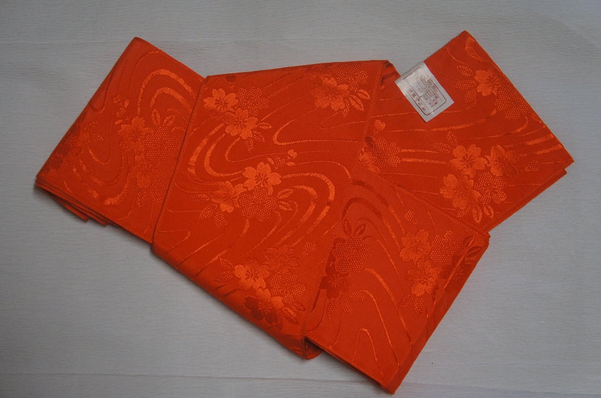 商品名化繊朱色地流水桜花地紋朱色地一本縞未仕立て未着用半巾帯[N15790]
