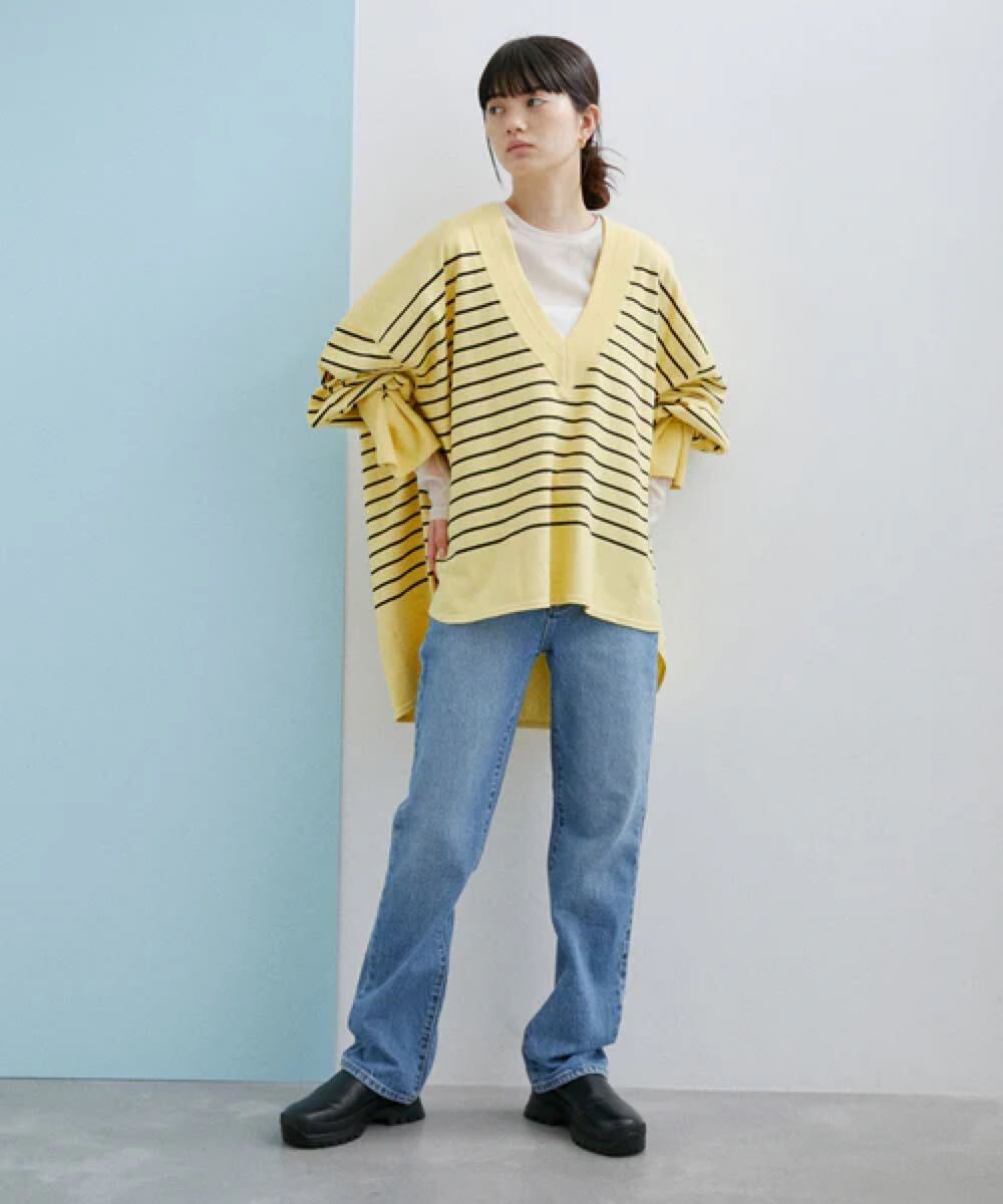 クルーネックやタートルネックに重ねたり、キャミソールやタンクトップに重ねたりと、襟開き部分のレイヤードを楽しんで。ゆったりとしたサイズ感なので、ボトムには細身パンツやデニムパンツ、スラックスパンツなどですっきりと合わせるのがおすすめ。