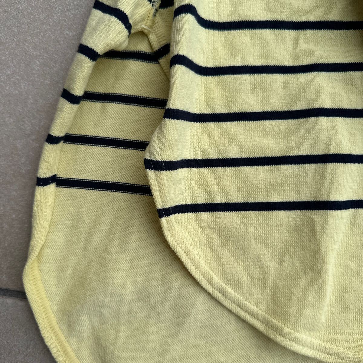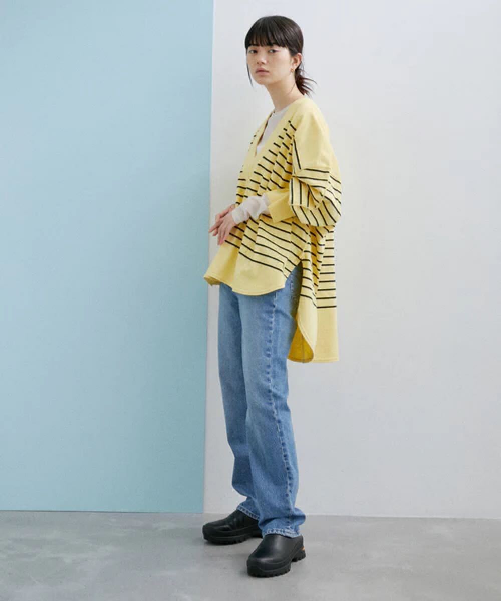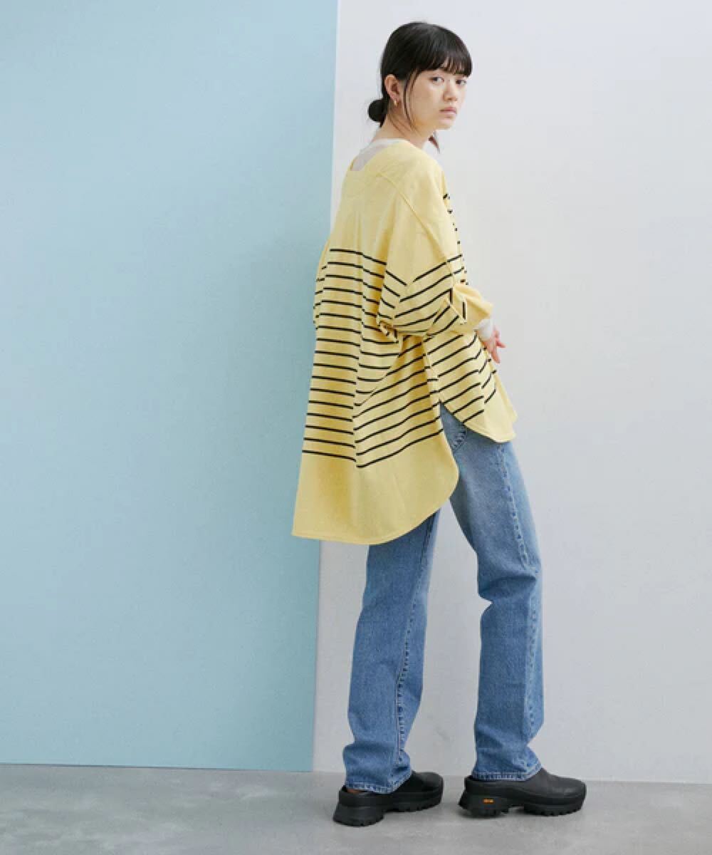 ゆったりとしたサイズ感と丸いヘムラインが特徴的な、パネルボーダーのロングスリーブTシャツ。ヒップ下までの長めの着丈がスタイルカバーしてくれるデザインで、潔く深いVネック開きや、襟部分と袖口をリブで仕上げてメリハリを付けているのもこだわりのポイント。袖口は、そのままの太さでゆるさを楽しんだり、ボタンでアジャストして細く着ることも可能な仕様。