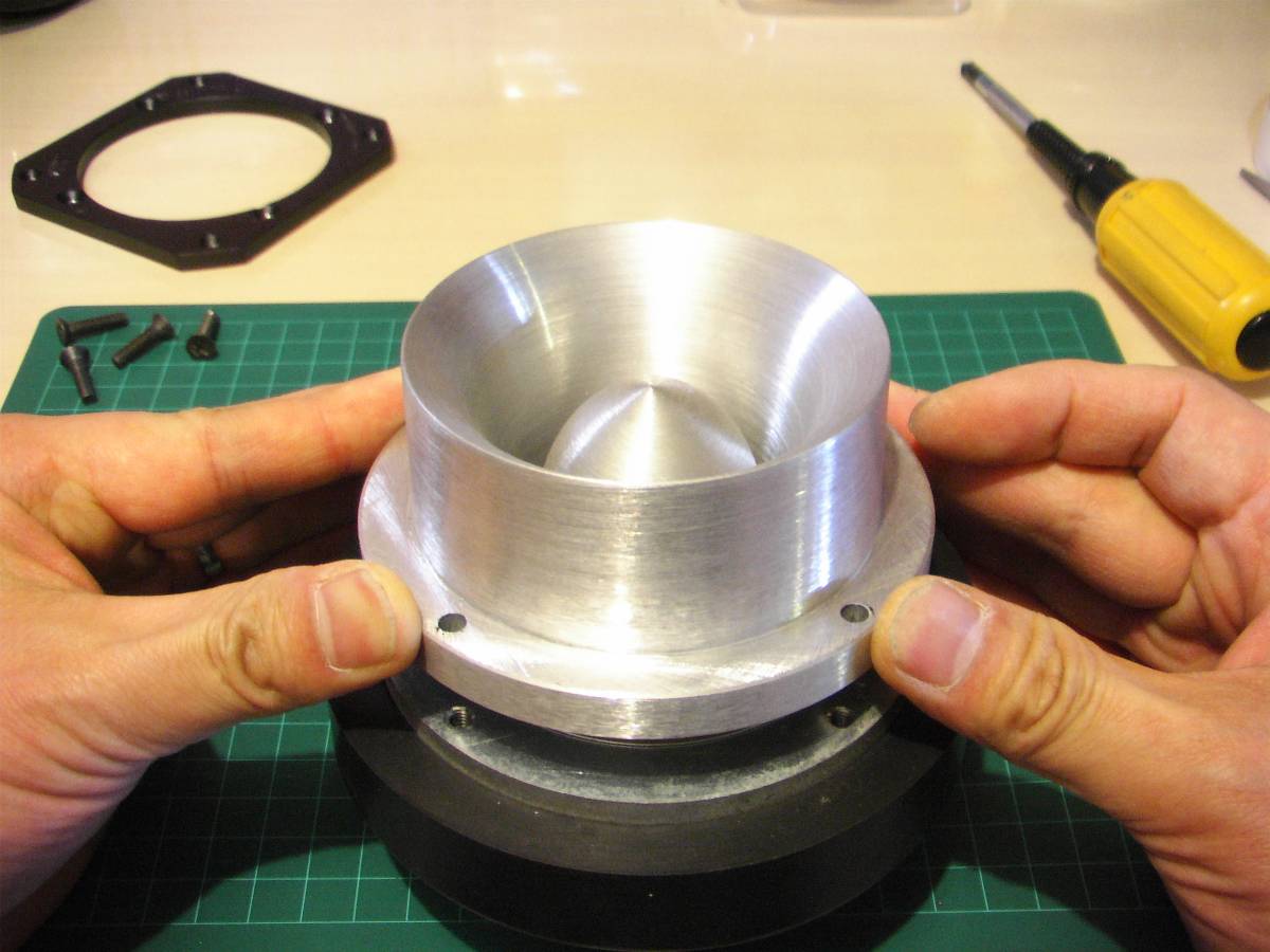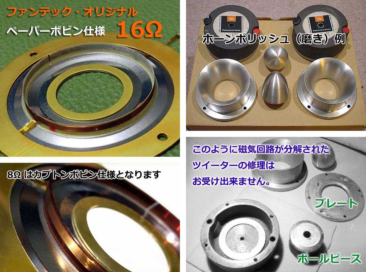 FUNTEQ オリジナル 075・16Ωアルミダイアフラム使用によるダイアフラム交換作業、及びメンテナンスサービスの出品です。 (当社にてダイアフラム交換作業を行います) 使用ダイアフラムは当社特注の 075 専用設計となっております。主にPA用を想定している一般的なチタン振動板+カプトンボビンではなく、純正と同じ仕様の 50μ・アルミ製振動板、ペーパーボビン、アルミエッジワイズ巻ボイスコイルの採用により、オリジナルにより近い音色を実現いたしました。 JBL リングラジエター式ツイーターのダイアフラム交換は簡単ではありません。適切な音圧と「JBLらしい芯の通った高音」、高音質を得るためには精密なセンタリングが不可欠です。 コンプレッションドライバー同様ガイドピンはありますが、JBL リングラジエター式ツイーターは装着するだけでは高音質を得られず、 1/100mm 単位の調整が必要となります。JBL(民生用)、JBL Professional ではガイドピンの直径から異なりますのでそのままでは汎用性はありません。また、ガイドピンの位置やギャップとの関係はそれぞれの個体差があり、当社では必ず個々のツイーターに合わせたガイドピン穴調整を行っております。