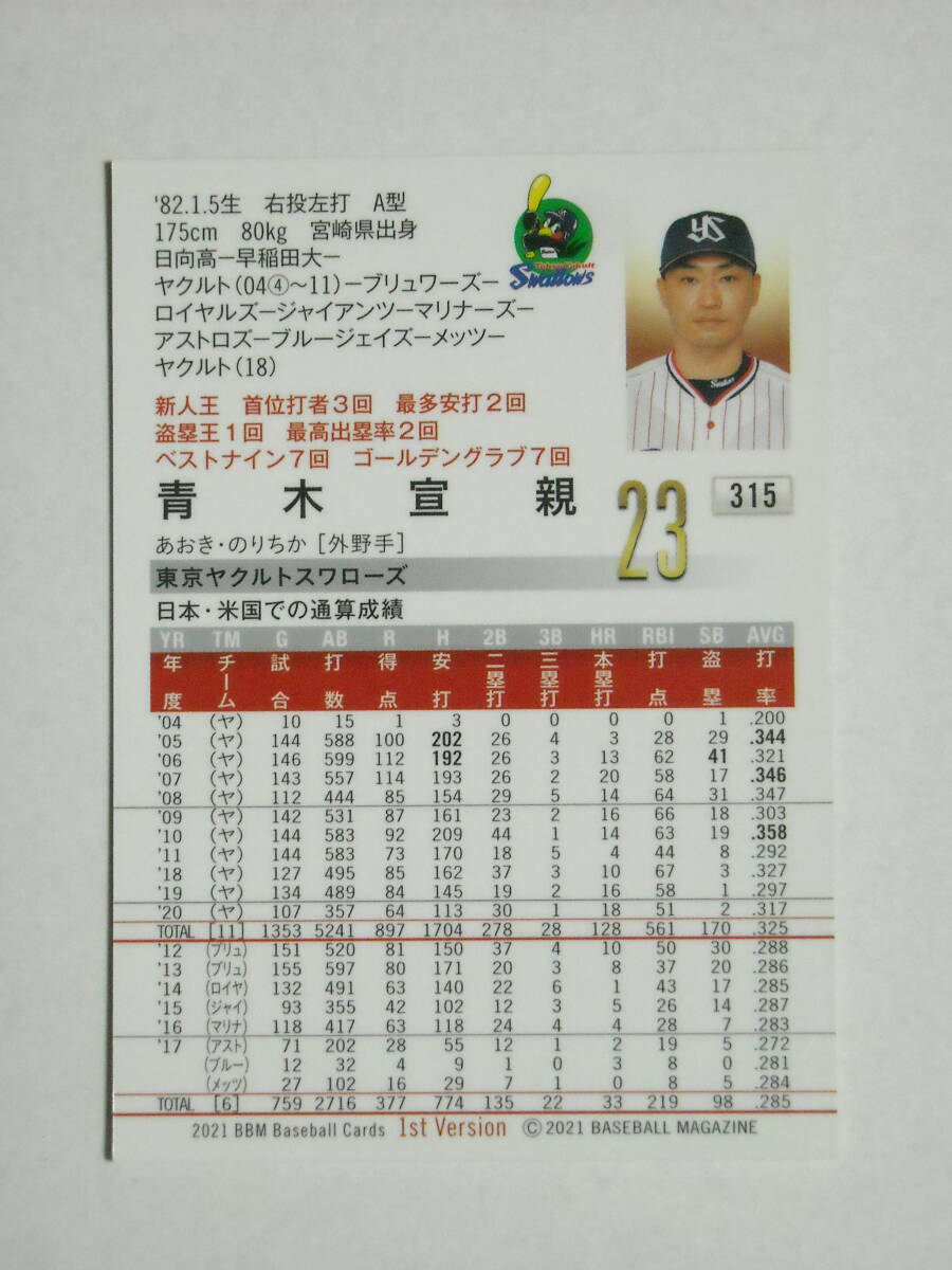 青木宣親 #315 BBM 2021 東京ヤクルトスワローズ 宮崎県日向市 日向高等学校卒 通算OPS837 打数6244
