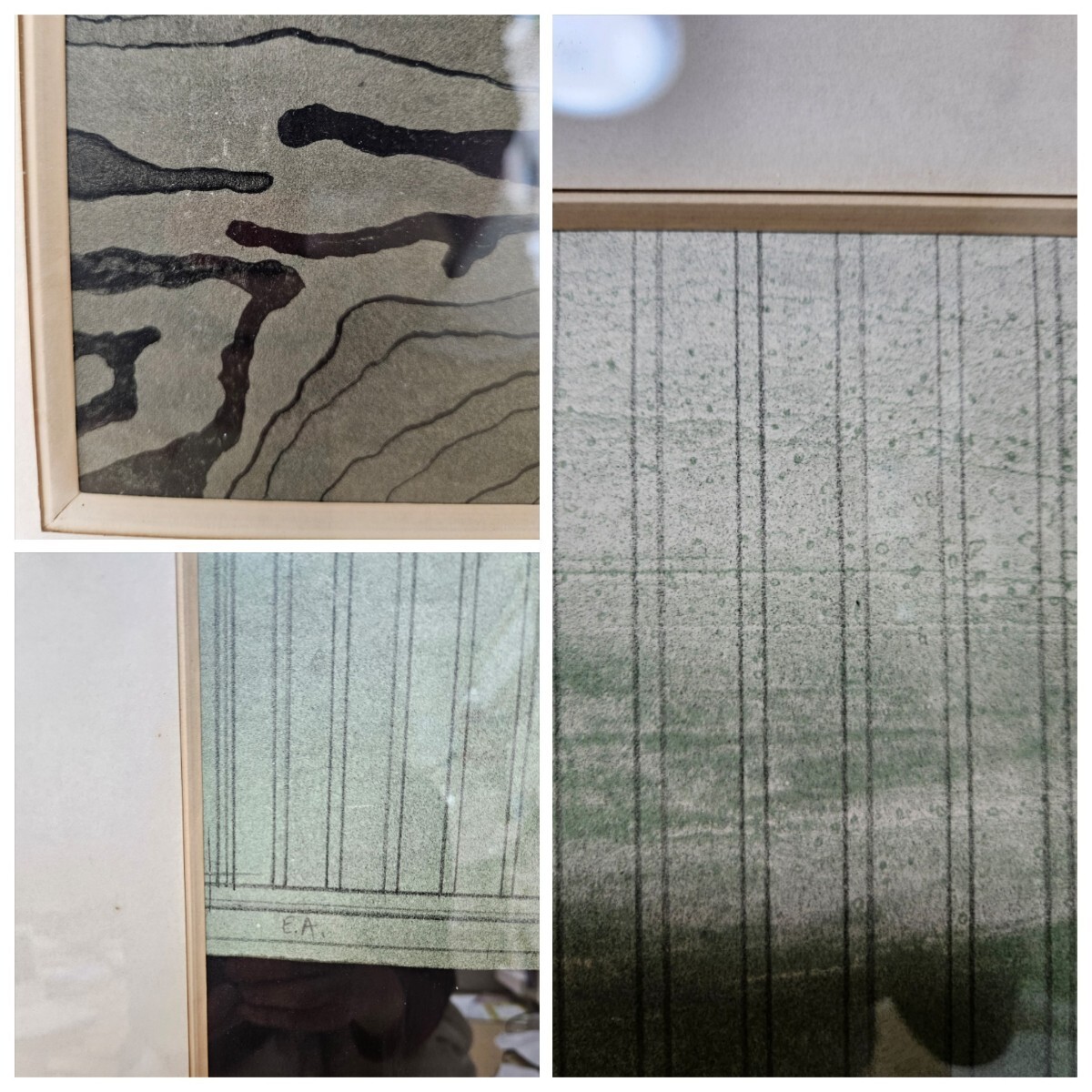 アクリル?は美品だと思いますが多少は小傷、よごれはあるかと思います。版画を楽しむのに邪魔な傷ではありません。