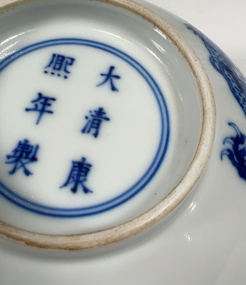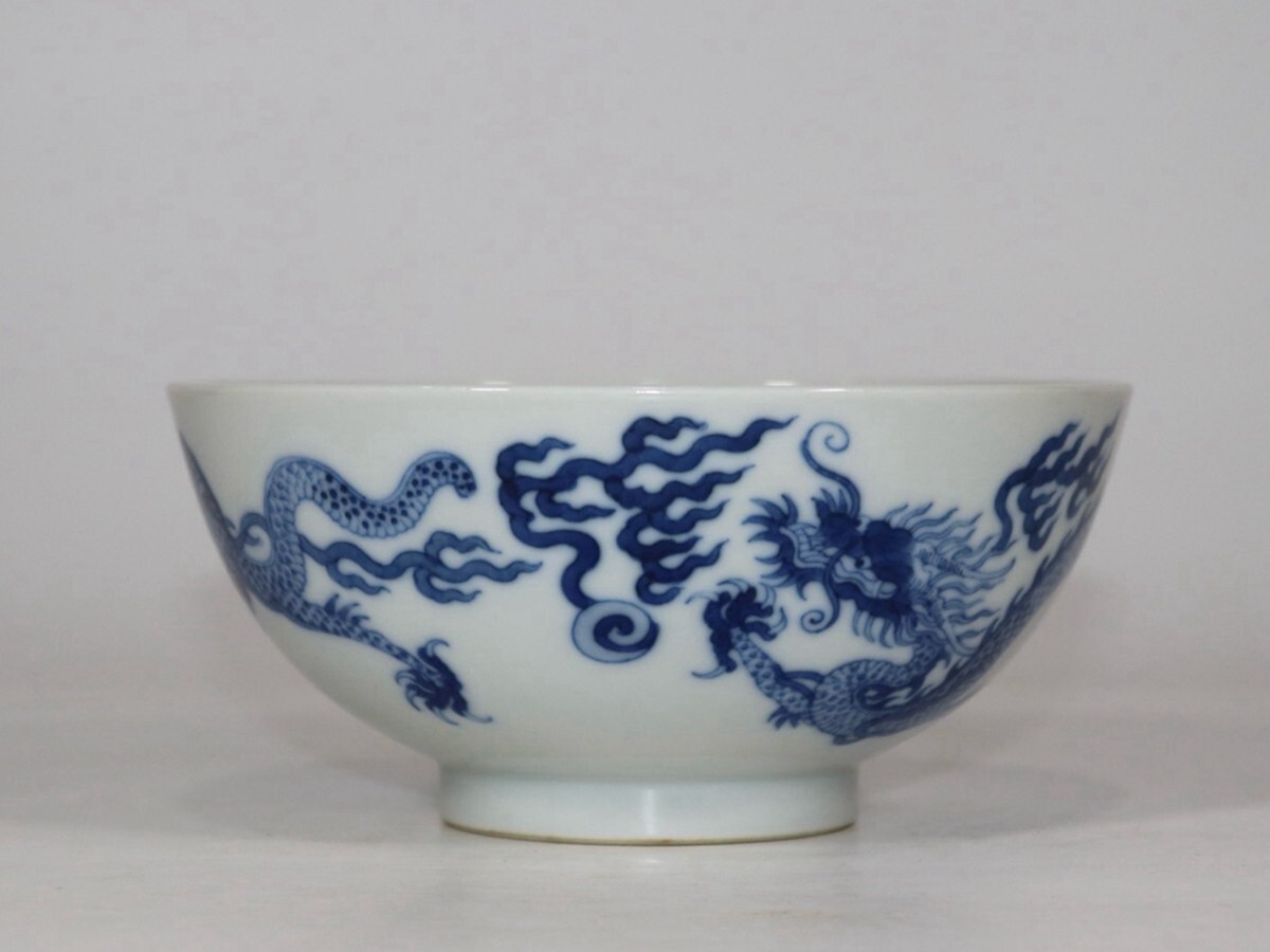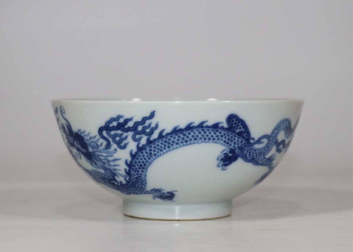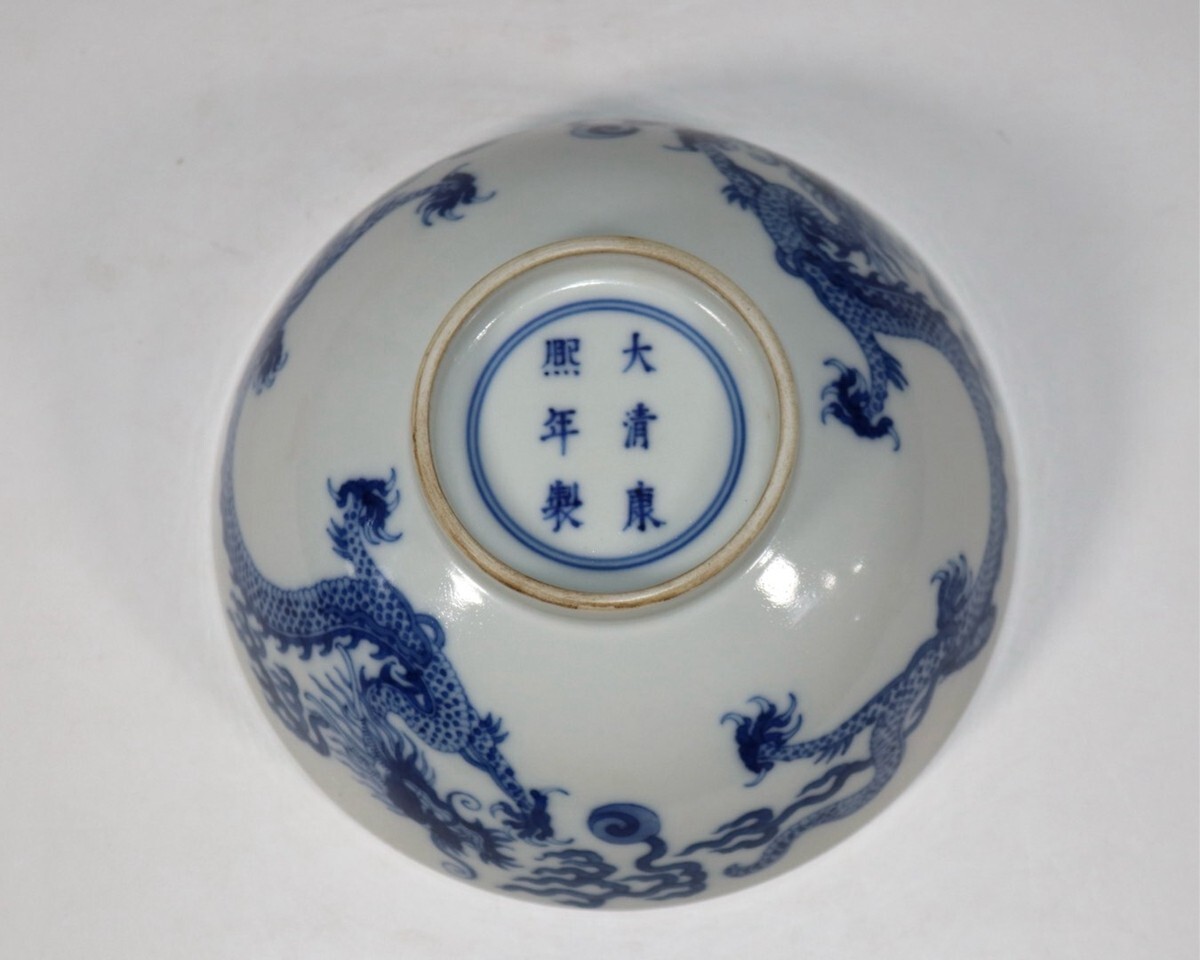 清代 大清康熙年製 陶磁器 青花双龍戲珠碗【仁】染付 置物擺件 古賞物 古美術 中国古玩 蔵出