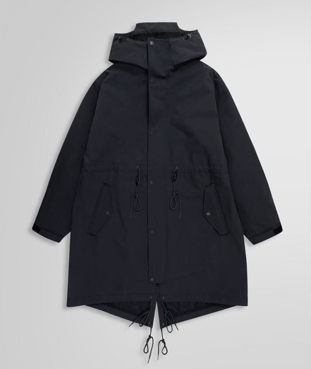 優れた透湿性と撥水強度を持つTPUメンブレン(熱可塑性ポリウレタン樹脂フィルム)をラミネートしたコットン/ナイロン生地を採用。ステッチ箇所をシームテープ処理することにより縫い目からの浸水もカバーし、フロントファスナーには止水ファスナーを使用しました。裾のドローストリングでシルエットを変えて着用できます。光沢を抑えたマットな質感とハリのあるシャープなシルエットでスポーティになりすぎない、大人のテックウェアです。タウンユースからアウトドアまで幅広いシーンで活躍します。