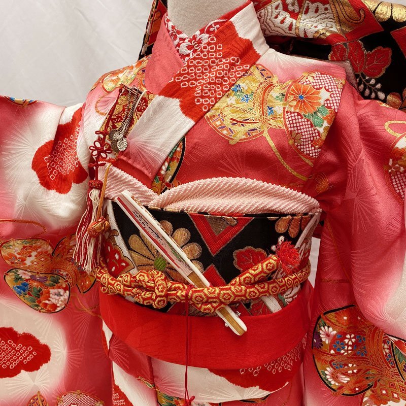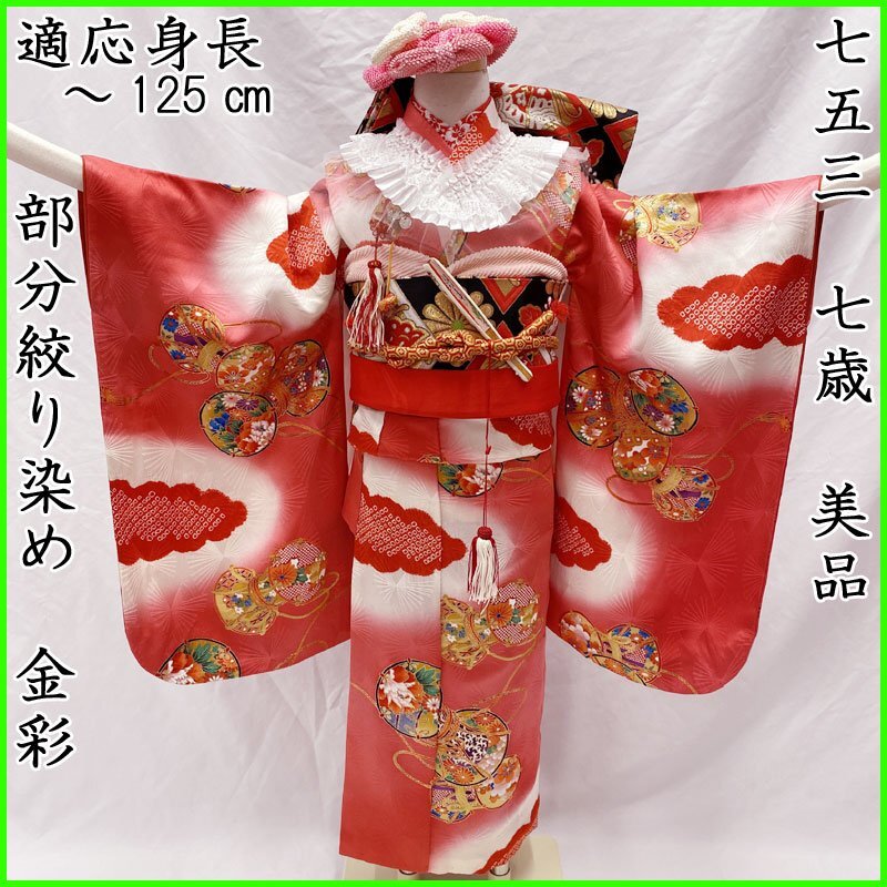 | ◎七五三 七歳 女児 着物&丸帯 小紋柄 部分絞り染め 鼓 濃い赤ピンク◎美品 (No.n) 文様が浮かび上がる光沢のある唐紅花色(赤に近い濃いピンク)の地に、部分絞り染めの雲取り、鼓文様がある素敵な7歳七五三のお着物と丸帯のセットです(その他の小物はセットに含まれません)。小紋柄で、金彩が施されております。 身丈がやや短いので、着丈を短く調整してブーツと合わせるとモダンな印象になります。七五三終了後はお正月やお節句にもご使用いただけます。 お小物類(帯揚げ、帯締め、しごき、筥迫、末広)をご希望の方はおまかせとなりますが、別途6000円頂戴します。*画像のヘッドピース、付け衿、楽々衿はセットに含まれておりません。 (着物)やや身丈短めです。左衽に薄いシミがございますが、画像のように目立ちません。他にシミ・ダメージなく美品です。肩上げをしておりませんので、お子様の裄丈に合わせてお直しをお願いします。 (長襦袢)こちらには長襦袢が付属いたしません。代わりにお子様の負担が少なく、便利な子ども用楽々衿をお勧めします。#ag楽々衿 (帯)画像のような薄いシミが他にも数か所ございますが、近くで見ないとわからない程度でお着付け具合で見えなくなくなります。 【素材】(着物)正絹、(帯)正絹 【色】唐紅花(赤に近い濃いピンク) *モニターによって色味は実際と異なる場合がございます。 【サイズ】(着物) 裄:56.8cm、肩上げ:-cm、袖幅:30.7cm、袖丈:60cm、丈(肩から):120.1cm、腰上げ:-cm、前幅:20.4cm、後幅:25.5cm (帯) 幅:21.1cm、長さ:358cm *素人採寸のため、多少の誤差はご容赦ください。 お求め安い価格での出品ですので、いかがでしょうか? | |