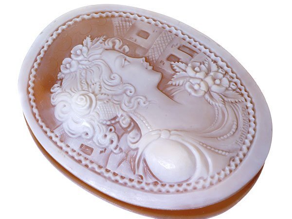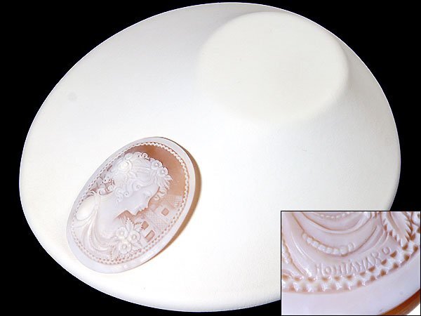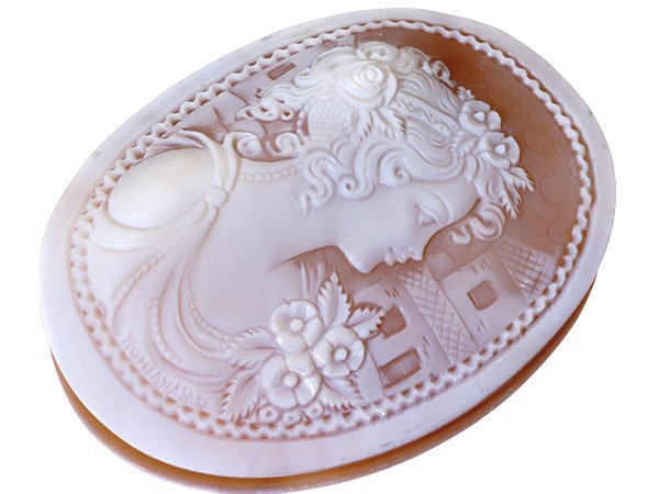 作家品【作家名サイン刻印有り/作家名特定できず】の作品!華やかな貴婦人と花の彫刻が素敵な高級シェルカメオルースを激安価格で特別大放出致します!