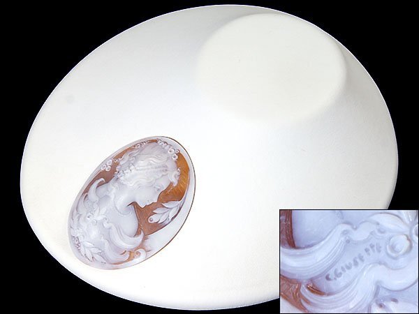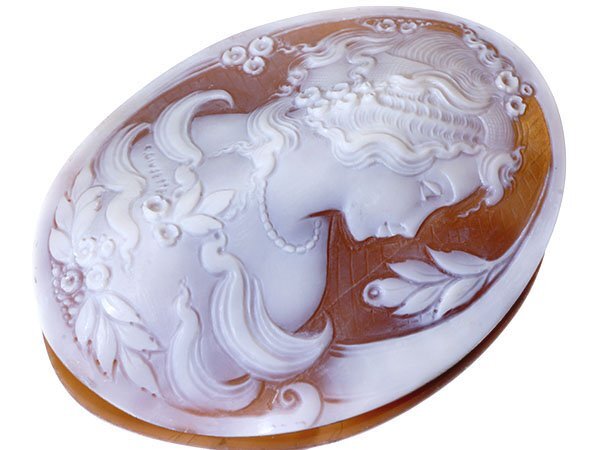 作家品【作家名サイン刻印有り/作家名特定できず】の作品!上品な女性と花の彫刻が素敵な高級シェルカメオルースを激安価格で特別大放出致します!