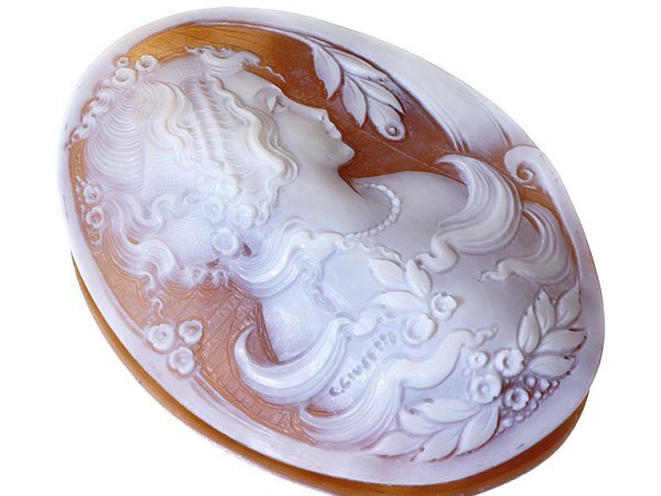 上品な女性と花を繊細に彫刻で演出した、素晴らしい高級シェルカメオルースです!
