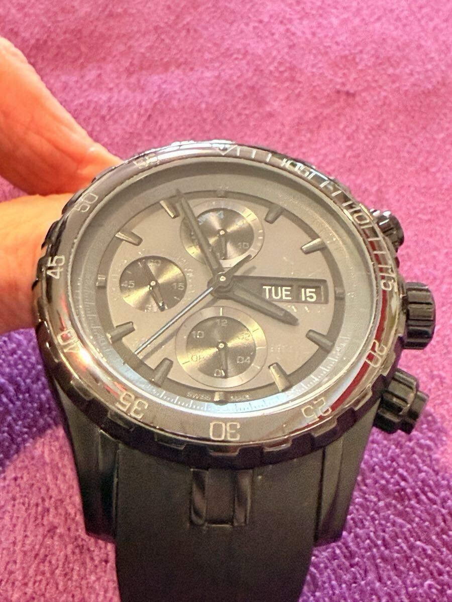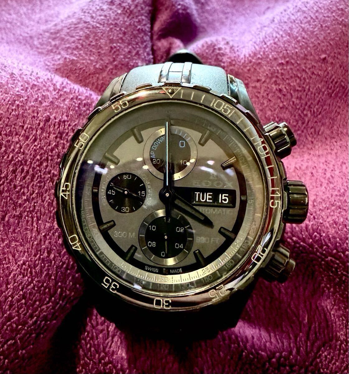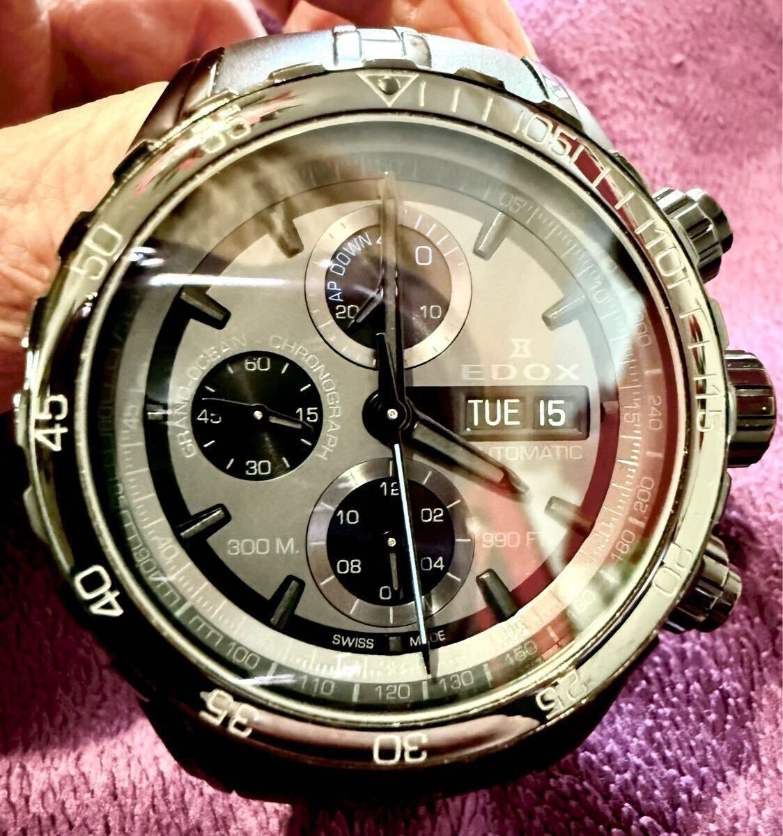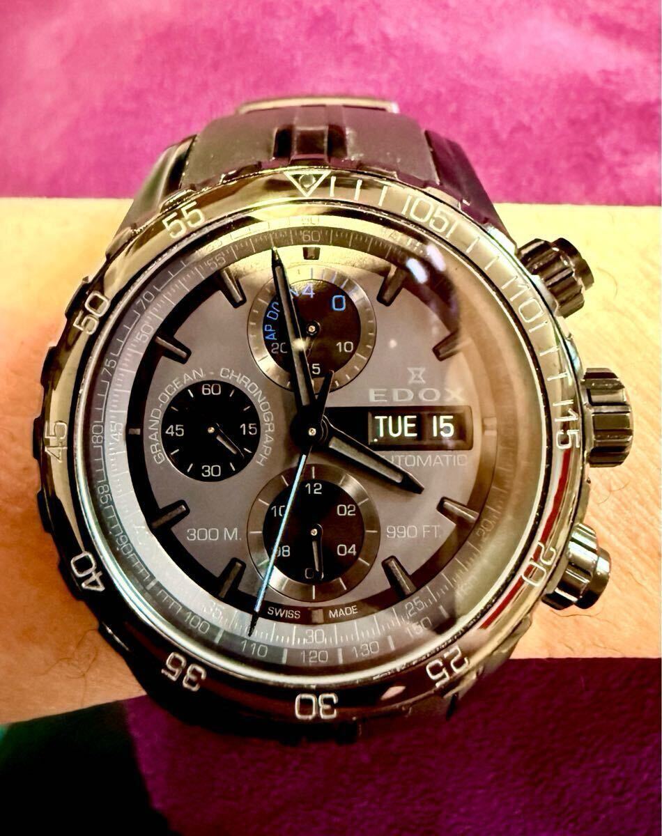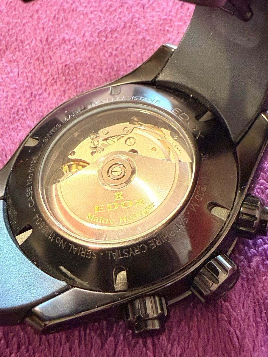 エドックス グランドオーシャン ラバーブラックのクロノグラフです。 ブラック文字盤にブルーの差し色が綺麗です。